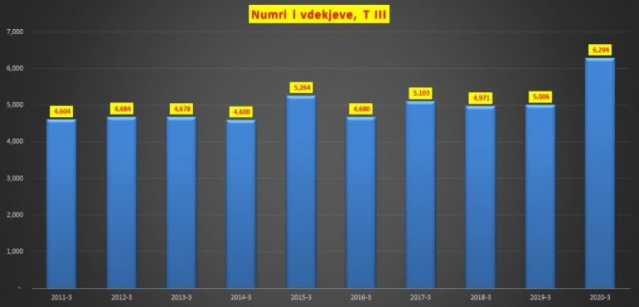 Ndërsa vetëm për tremujorin e tretë 2020, vdekjet janë gati 30% më të larta sesa mesatarja historike e periudhës 2011-2019 (mesatarja e 2011-2019 është 4,988 persona).