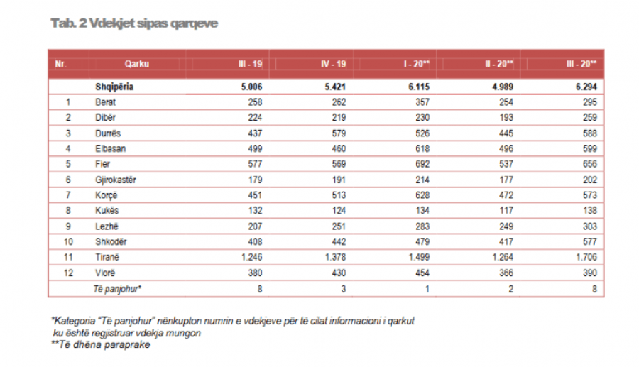 Sipas INSTAT, Në tremujorin e tretë 2020,në të dymbëdhjetë qarqet e vendit shënohet rritje e numrit të vdekjeve, në krahasim me të njëjtën periudhë të vitit 2019. Në tremujorin e tretë2020,numri më i vogël i vdekjeve regjistrohet në qarkun e Kukësit, me 138 vdekje, ndërsa ai më i lartë në qarkun e Tiranës, me 1.706 vdekje. Rritjen më të vogël në përqindje të vdekjeve, gjatë tremujorit të tretë 2020, krahasuar me të njëjtën periudhë të vitit 2019 e ka qarku i Vlorës, me 2,6%, ndërsa rritjen më të madhe në përqindje e ka qarku i Lezhës, me 46,4%.