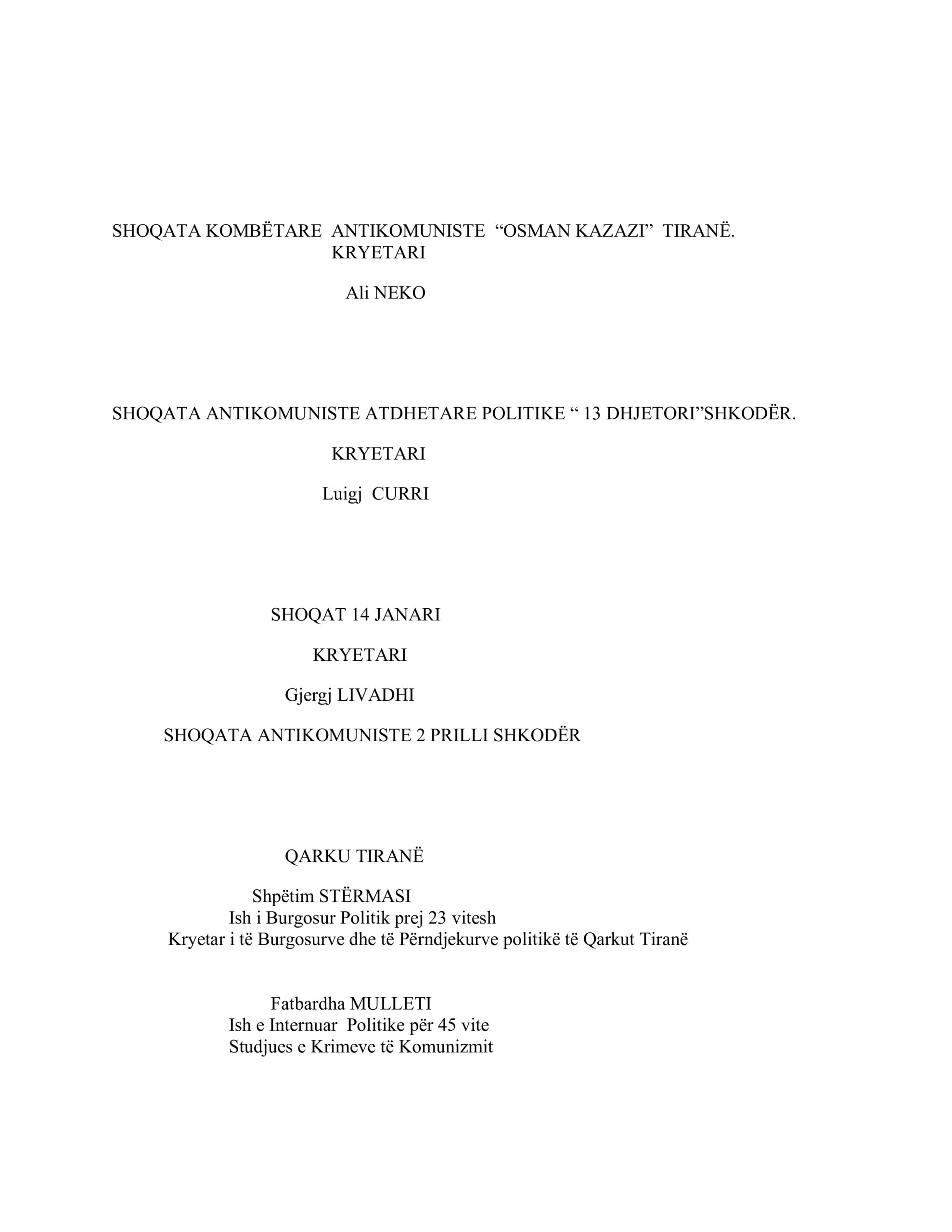 Besojmë se kjo thirrje kombëtare, që vjen nga ata që nuk ia dorëzuan lirinë plumbave të komunizmit, do të prekë ndërgjegjen tuaj dhe do të ndikojë në vendimmarrjen tuaj. Pas 35 vitesh, është koha që kjo demokraci e deformuar të u japë të drejtë atyre që e lanë Shqipërinë me gjak, por nuk mbollën urrejtje. Vlerësoni këtë vlerë njerëzore që kemi përçuar për 35 vite me rradhë paqen! Mos harroni: krimi dhe padrejtësia kujtohen në breza. Mos lejoni prishjen e ekuilibrave në shoqërinë postkomuniste. Shqipëria ka nevojë për paqe! Nëse dëshiron, mund ta përgatis edhe në format zyrtar për përdorim publik (si letër e hapur apo komunikatë për shtyp), me titull, paragrafe më të strukturuara dhe me thekse sipas stilit të një kërkese institucionale. Vetëm më thuaj!