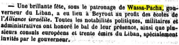 “Një festë e shkëlqyer, nën patronazhin e Vasë Pashait, guvernator i Libanit, u mbajt në Bejrut për nder të shkollave të Aleancës Izraelite. Të gjitha personalitetet politike, ushtarake dhe administrative e nderuan ballon me praninë e tyre, ashtu si dhe disa konsuj evropianë e tridhjetë emirë nga Libani, të ftuar posaçërisht nga guvernatori.”/darsiani.com