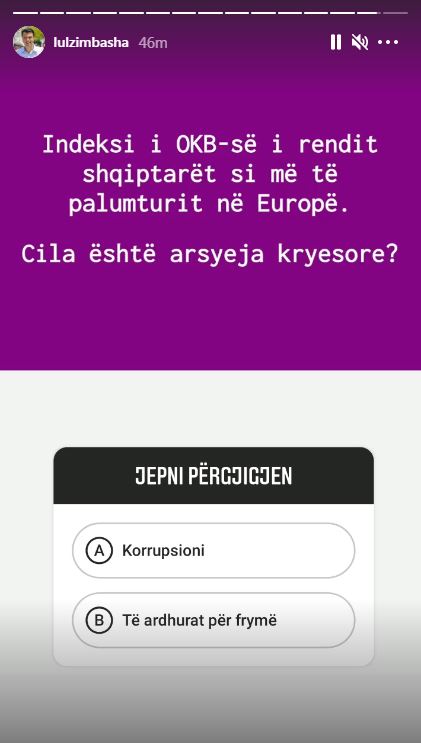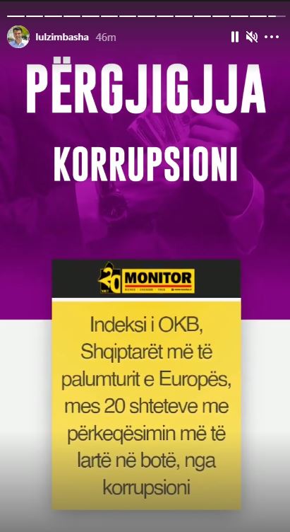 Në rubrikën e përditshme në faqen zyrtare të Instagramit, ”100 dështimet e Ramës në 8 vite”, kreu i PD-së, Lulzim Basha ka treguar se qeveria ”Rama” ka bërë që shqiptarët të renditen sipas OKB-së, si njerëzit më të palumturit në Europë dhe sipas Bashës, shkak kryesor është korrupsioni.