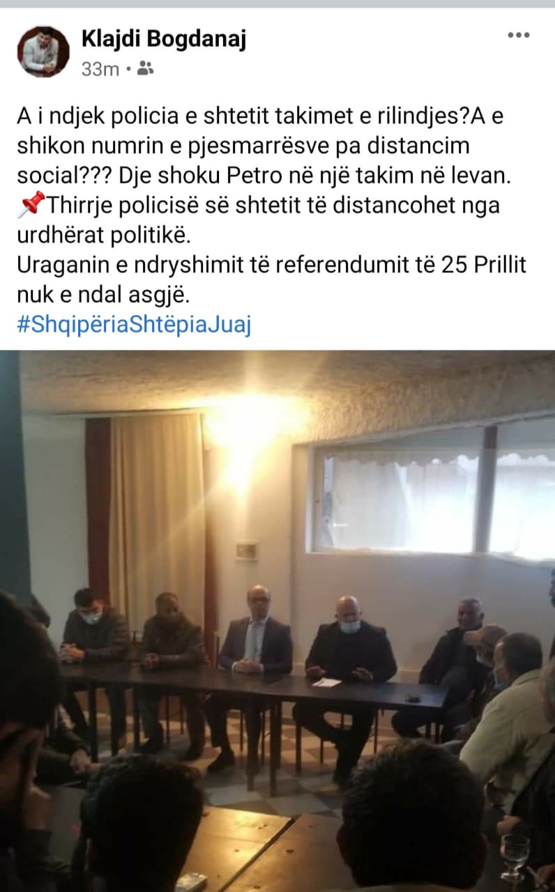 Sekretari i Përgjithshëm i LSI në Fier, Klajdi Bogdanaj, ka postuar një foto të Petro Koçit me mbështetësit e PS në Levan të Fierit. Në foto duket se janë më shumë 10 persona asnjëri nuk ruan distancën fizike e pak prej tyre janë me maska.