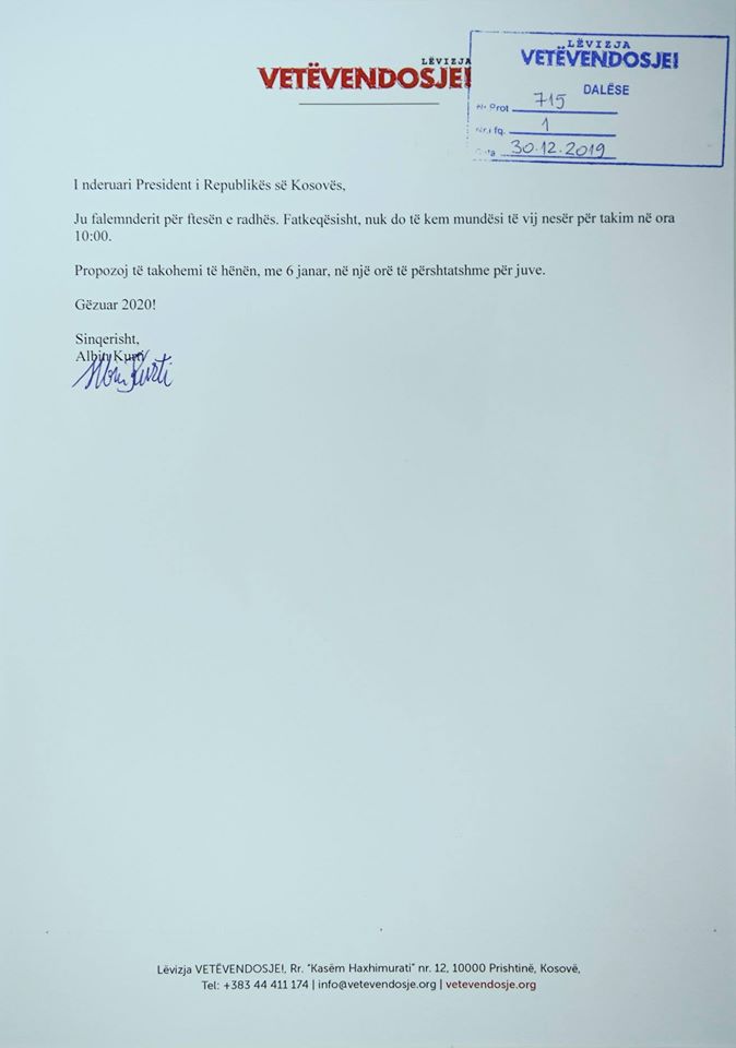 Albin Kurti, kandidati për kryeministër, i ka dërguar sot një letër Presidentit Thaçi ku i kërkon që ta shtyjnë për datën 6 janar 2020 takimin mes tyre.