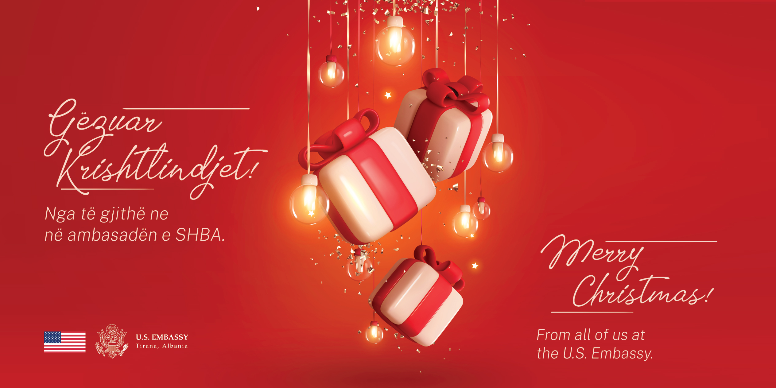 Ambasada amerikane në Tiranë, me anë të një kartoline të kuqe me një mesazh të shkurtër në të uron të gjithë qytetarët shqiptarë që sot festojnë Krishtlindjen.
