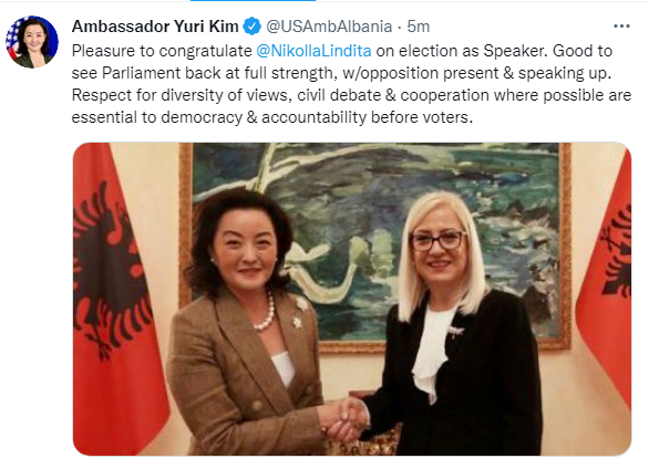 Ambasadorja Yuri Kim zbardh takimin me kryeparlamentaren Lindita Nikolla