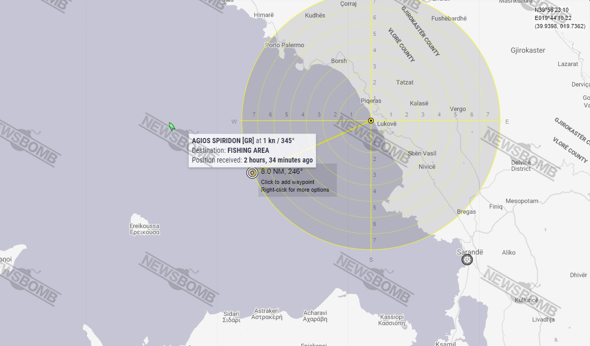 Vetëm një ditë pasi deklaroi zgjerimin në detin Jon me 12 milje, Greqia duket se ka vendosur të mos humbasë kohë duke nisur me shfrytëzimin e kësaj zone. Një anije greke peshkimi është lokalizuar sot në ujërat fare pranë kufirit detar të pretenduar nga shteti fqinj, vetëm 8 milje larg bregdetit të fshatit Lukovë dhe 7 milje nga ishulli grek i Erikuzës.