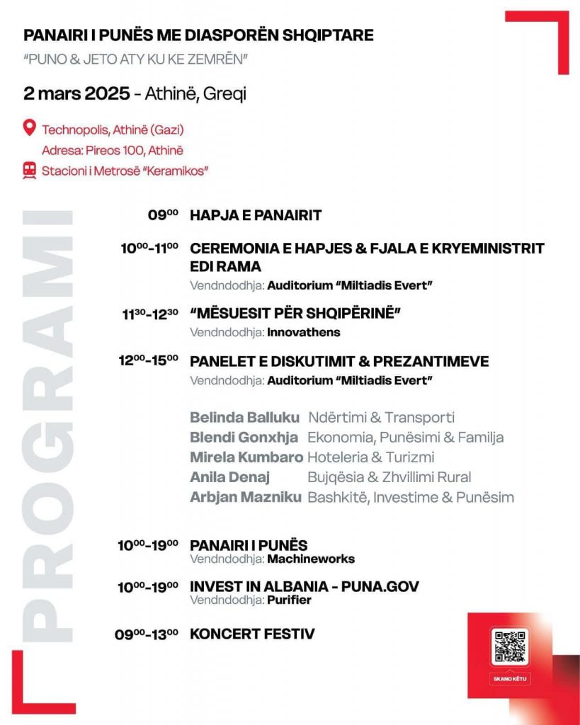 Sot, në Athinë, hap dyert Panairi i Punës, i cili mbledh shqiptarët që jetojnë dhe punojnë në Greqi, me qëllimin për t’i lidhur ata me mundësi punësimi dhe investimi në Shqipëri. Ky është panairi i parë i këtij lloji, i organizuar me moton “Puno dhe jeto aty ku ke zemrën,” dhe synon të ofrojë mundësi konkrete për shqiptarët që dëshirojnë të investojnë apo rikthehen në atdhe.