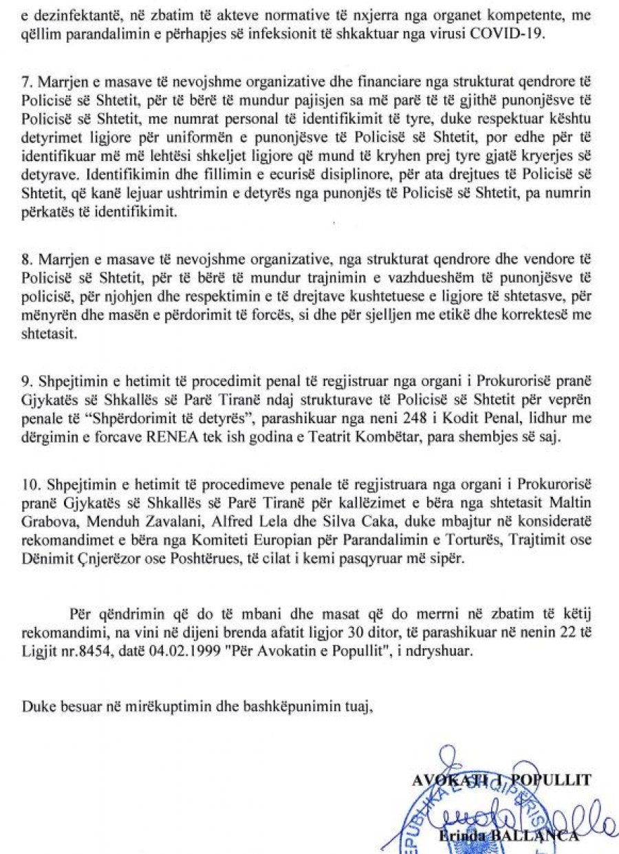 Kërkesa është bërë pasi Avokati i Popullit publikoi konkluzionet e rekomandimeve mbi sjelljen e Policisë së Shtetit gjatë shkatërrimit të Teatrit Kombëtar.
