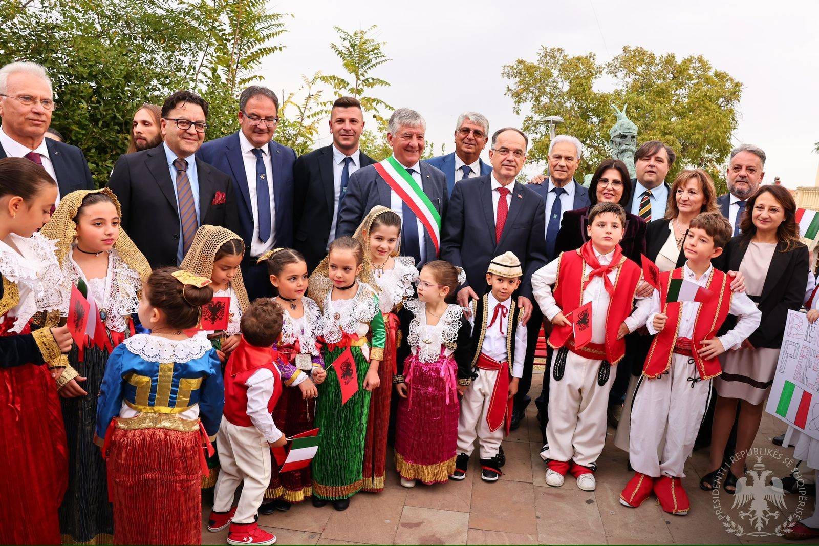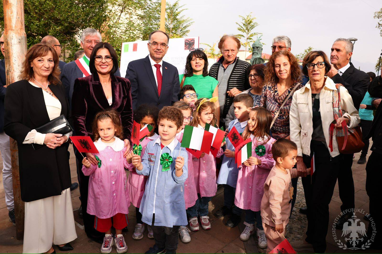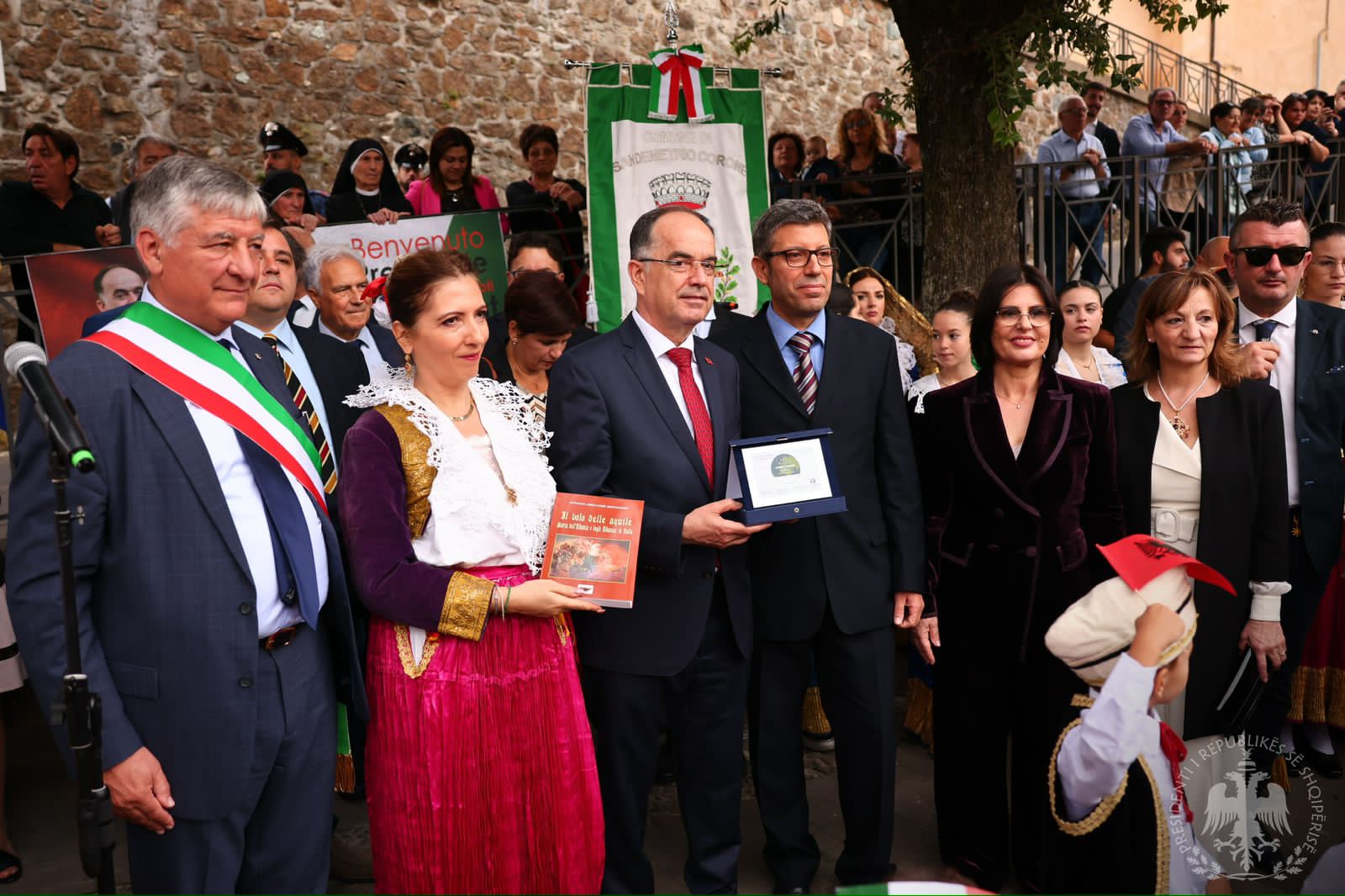 Sheshi i Monumentit në “San Demetrio Corone” ishte dekoruar me flamuj shqiptarë, ndërsa femijët që kishin dalë për të pritur Presidentin Begaj veç pankartave të mirëseardhjes, mbanin flamujt e dy shteteve.