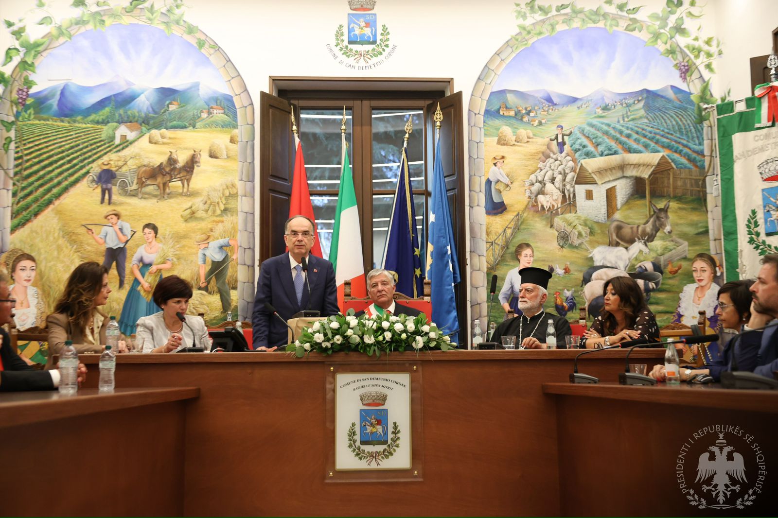 Duke përmendur figura të rëndësishme të letërsisë, kulturës dhe politikës arbëreshe, Presidenti i Republikës u shpreh se tek arbëreshët ai sheh rojtarët më të mirë të shpirtit identitar, të gjuhës, kulturës dhe riteve fetare.