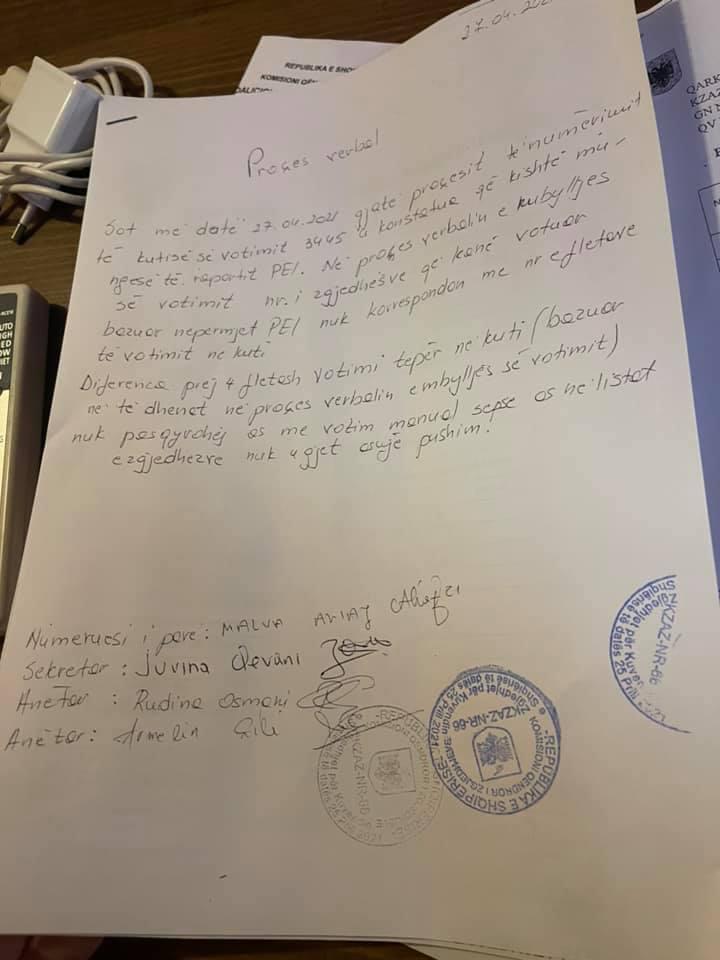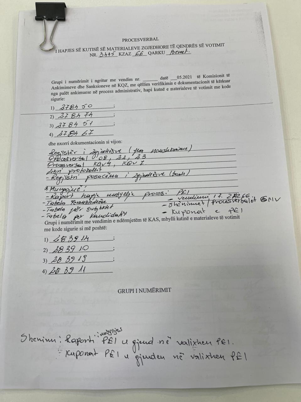 Procesverbali ne Berat ku numeruesit te gjithe pranojne se nuk ka raport PEI. Procesverbali i KQZ pasi hapen kutite, ku raportohet se nuk ka raport PEI. Shenimi ne fund me dore, qe tregon qe fusin duart me materiale nga jashte