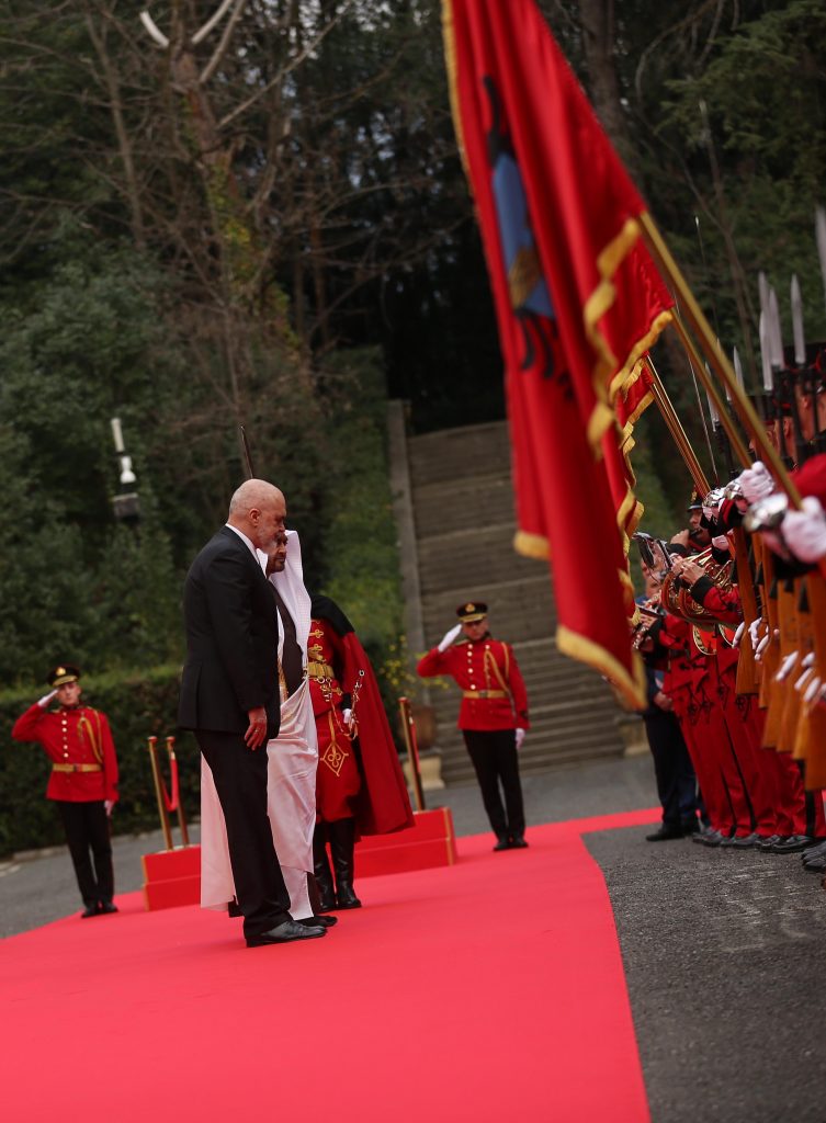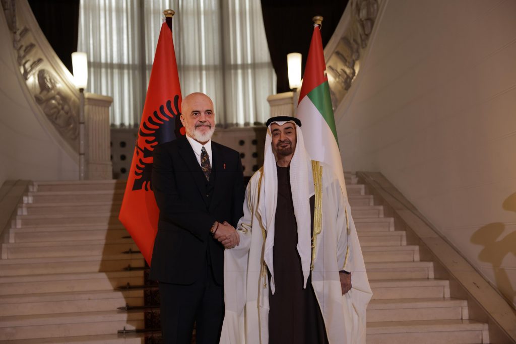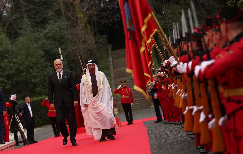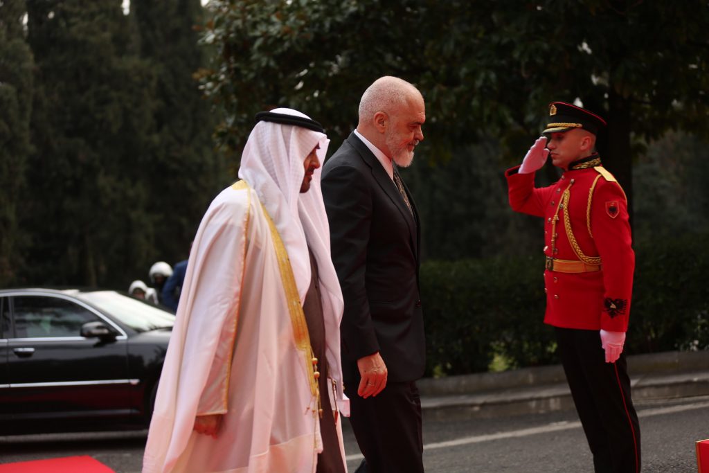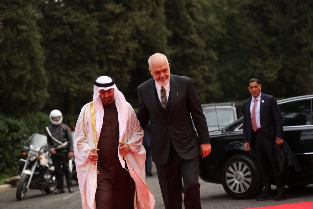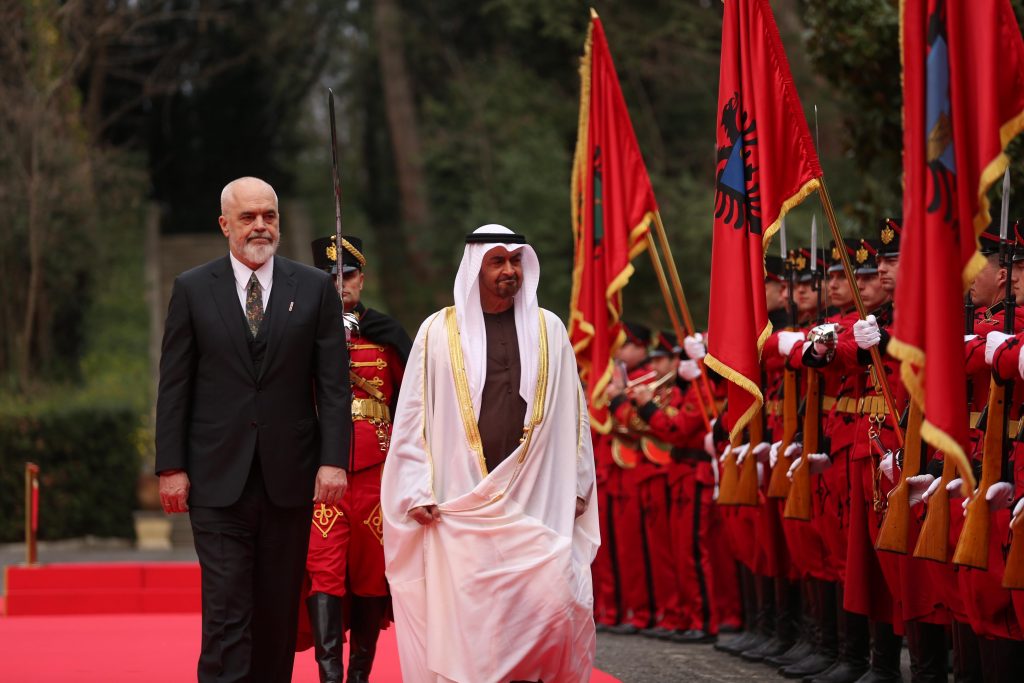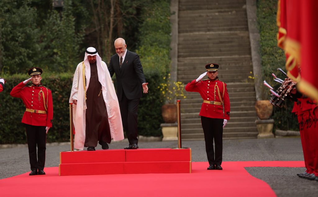 Presidenti i Emirateve të Bashkuara Arabe, Mohamed bin Zayed Al Nahyan, i cili nisi rreth orës 16:00 vizitën e tij në Tiranë, u prit me ceremoni zyrtare në Pallatin e Brigadave.