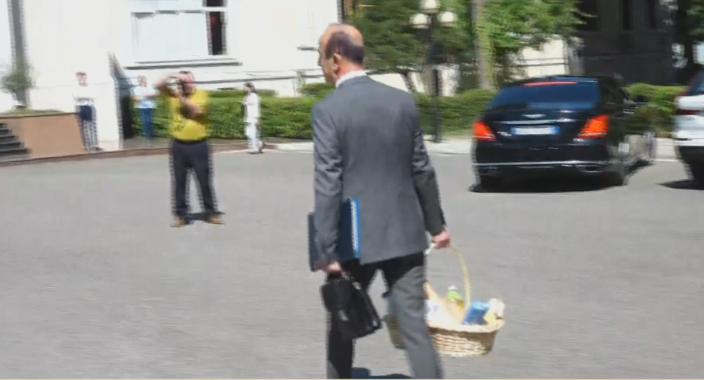 Deputeti i PD-së proteston me një shportë ushqimesh në dorë para Parlamentit (FOTO)