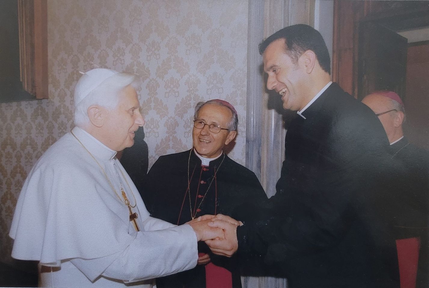 “Vatikan – Maj 2008 me Papa Benediktin XVI, kur isha student në Romë në Universitetin Gregorian.