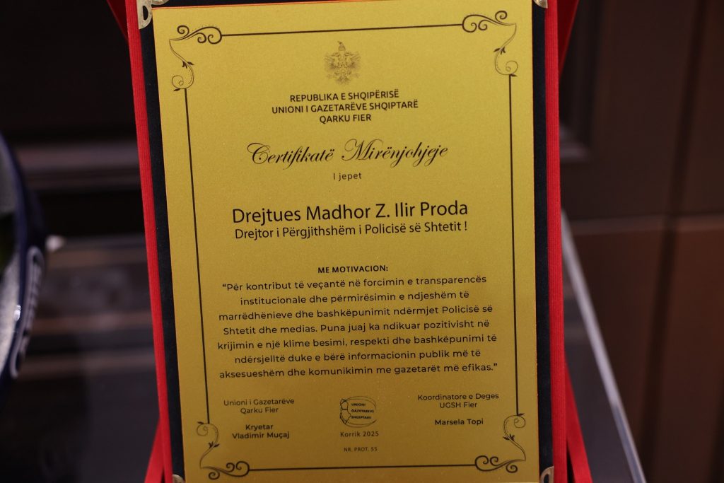 Në këtë frymë pozitive bashkëpunimi, në emër të gazetarëve të qarkut Fier, kryetari i Unionit, Vladimir Muçaj, njëkohësisht drejtor i medias online “Newsalbania”, së bashku me gazetarët Mariglen Bita dhe Ervis Profka (Fieri web.com), si dhe gazetarin e mirënjohur Fatmir Popja, i cili është një nga themeluesit e Unionit të Gazetarëve Shqiptarë, i dorëzuan drejtorit të Përgjithshëm të Policisë së Shtetit, Ilir Proda, “Çertifikatën e Mirënjohjes”, me motivacionin: “Për kontribut të veçantë në forcimin e transparencës institucionale dhe përmirësimin e ndjeshëm të marrëdhënieve dhe bashkëpunimit ndërmjet Policisë së Shtetit dhe medias. Puna juaj ka ndikuar pozitivisht në krijimin e një klime besimi, respekti dhe bashkëpunimi të ndërsjellë, duke e bërë informacionin publik më të aksesueshëm dhe komunikimin me gazetarët më efikas.”