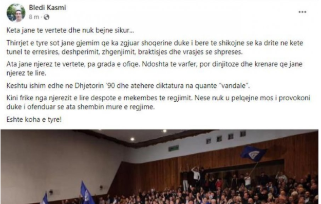 Kini frikë nga njerëzit e lirë, despotë e mëkembës të regjimit. Nëse nuk u pëlqejnë mos i provokoni (demokratët e Foltores) duke i ofenduar se ata shembin mure e regjime. Është koha e tyre!”, shkruan Bledi Kasmi.
