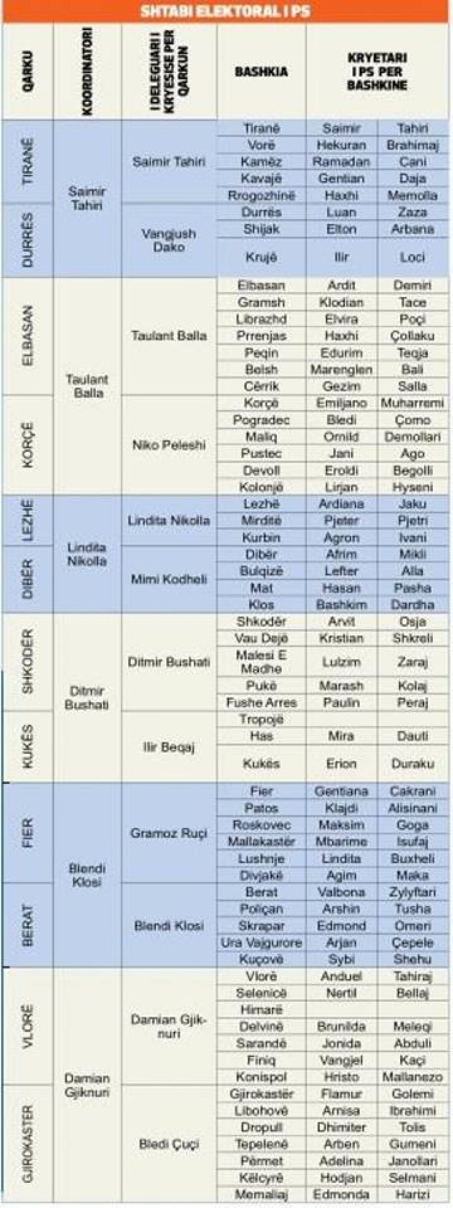 Janë 6 koordinatorë rajonesh, 12 qarqesh dhe 61 bashkish. Ky është shtabi themelor elektoral i Partisë Socialiste për zgjedhjet parlamentare të vitit 2017. Shqiptarja.com sjell skemën e plotë organizative dhe emrat që po drejtojnë fushatën tashmë të filluar të partisë më të madhe të mazhorancës për garën e ardhshme.
