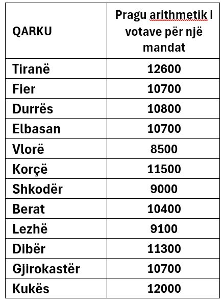Duke ndërthurur të dhënat e mësipërme, kam bërë një parashikim paraprak të pragut aritmetik për mandat në çdo qark (shihni tabelën e mëposhtme). Pragu aritmetik në një qark shërben si orientim jo vetëm për partitë e vogla që synojnë ta kalojnë pragun, por edhe për partitë e mëdha që synojnë të marrin disa mandate në secilin qark.
