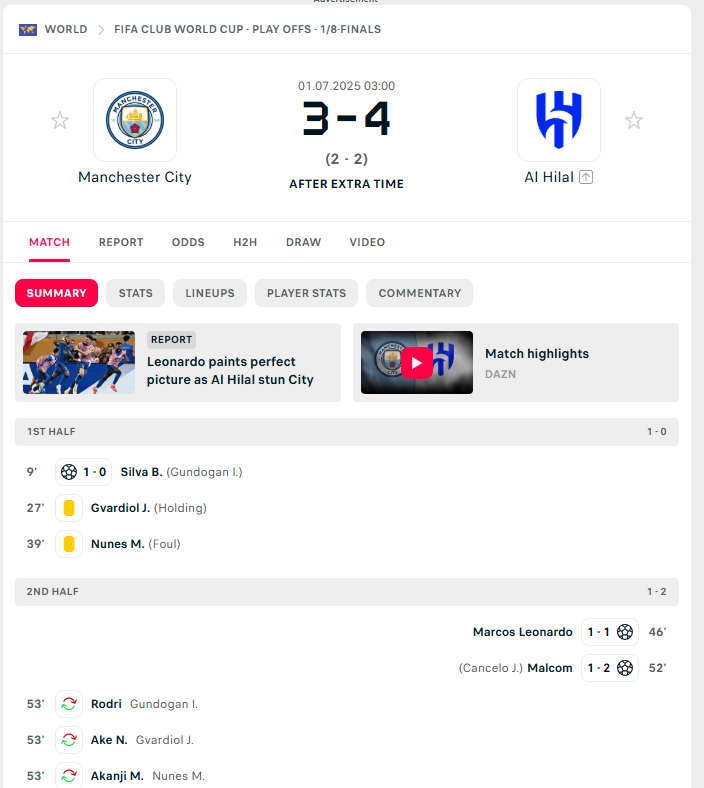 Ekipi Al Hilal i Arabisë Saudite shkatërron Manchester City 4 me 3 për Botërorin e Klubeve