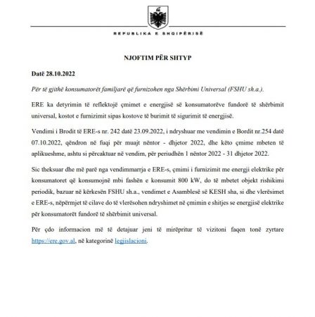 “Për të gjithë konsumatorët familjarë që furnizohen nga Shërbimi Universal (FSHU sh.a.). ERE ka detyrimin të reflektojë çmimet e energjisë së konsumatorëve fundorë të shërbimit universal, kostot e furnizimit sipas kostove të burimit të sigurimit të energjisë.
