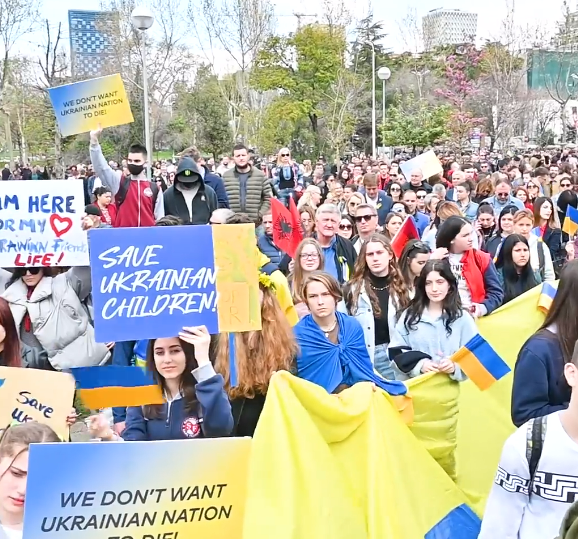 Në mbështetje të qëndresës heroike të popullit ukrainas kundër agresionit rus, komuniteti ukrainas në Shqipëris organizoi protestën në Tiranë, ku morën pjesë disa qindra mijëra qytetarë (08.04). Manifestuesve iu bashkuan edhe përfaqësues të trupit diplomatiktë akredituar në Tiranë, kryetari i Bashkisë së kryeqytetut Erion Veliaj, politikanë, organizata të shoqërisë civile.