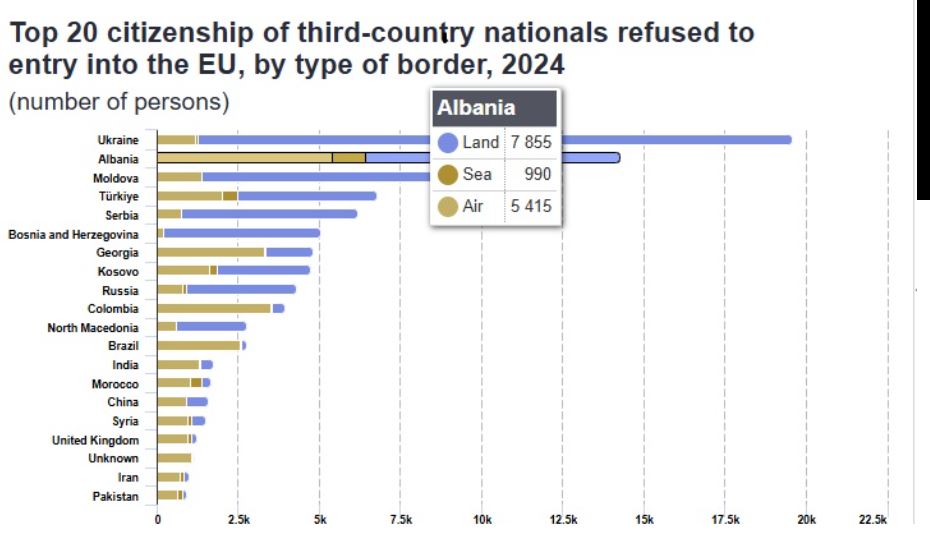Shqiptarët janë të dytët më të refuzuarit në kufijtë e Bashkimit Europian, pas ukrainasve (19 595). Në total në kufijtë tokësor, ajror dhe detar në vitin 2024 janë refuzuar 14,260 shtetas shqiptar, ku gjysma në kufijtë tokësorë (7855). Gjysma e totalit janë refuzuar në shtet fqinjë, Greqi dhe Itali, ndërsa pjesa tjetër e shpërndarë në Lituani, Hungari, Gjermani etj.
