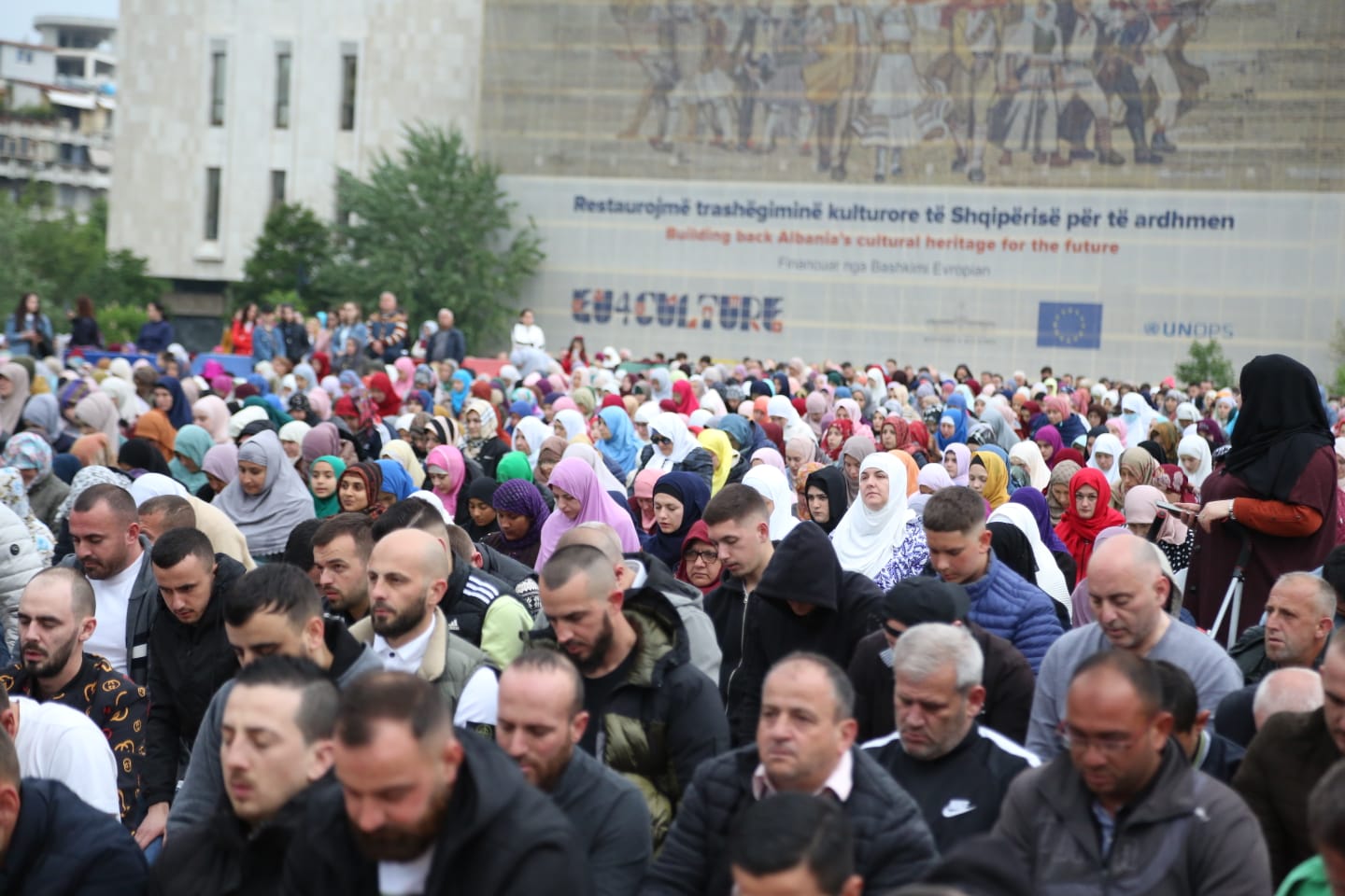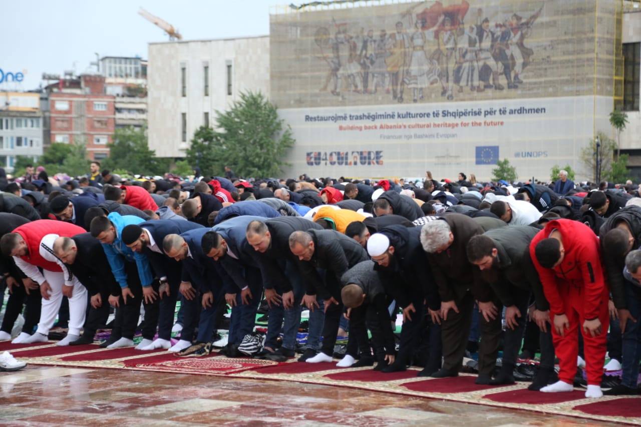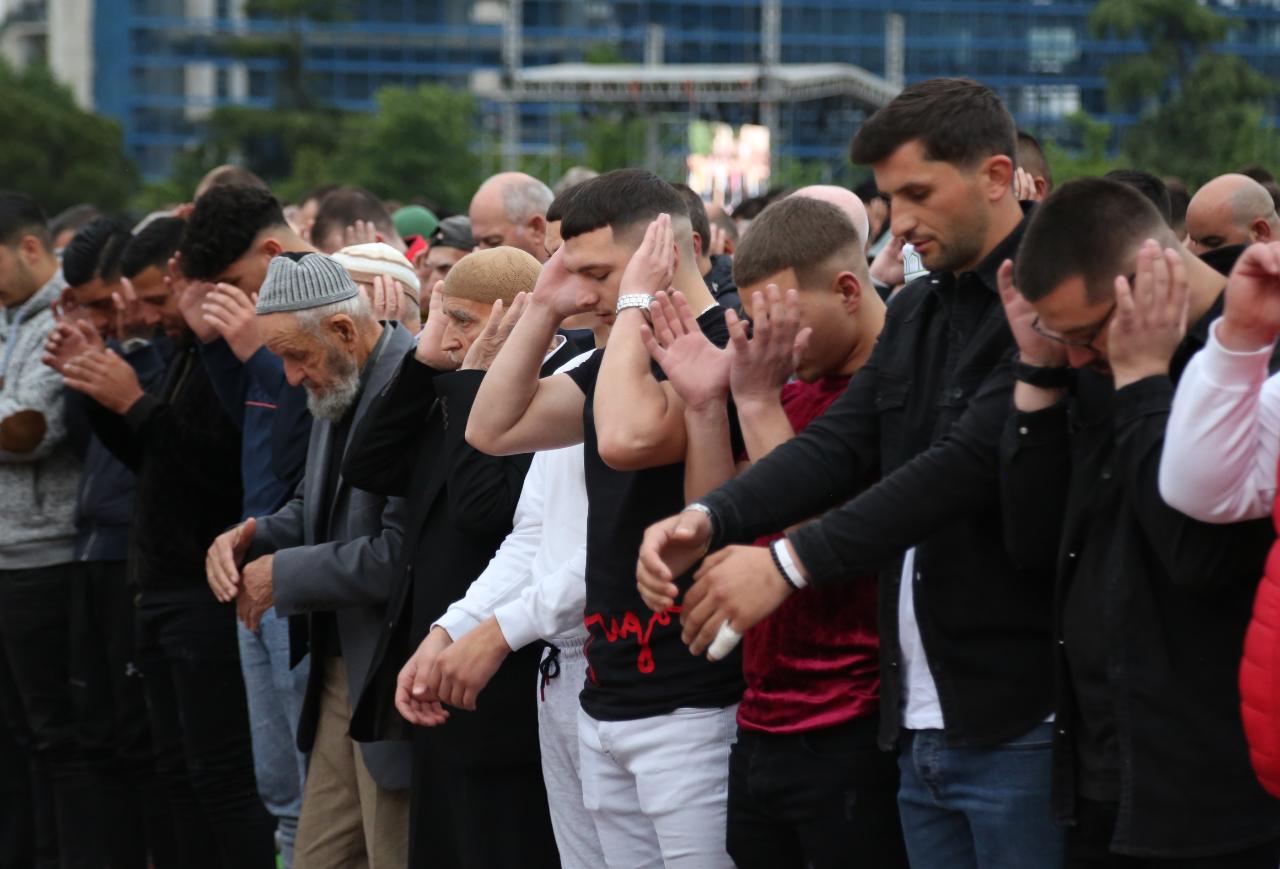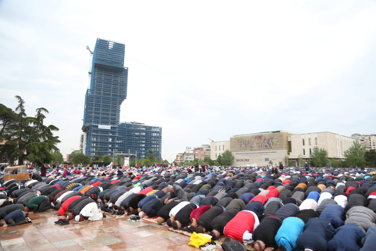 Sheshi “Skënderbej” është mbushur mëngjesin e sotëm nga mijëra besimtarë myslimanë, ku u organizua ceremonia e faljes së namazit të Fiter Bajramit në Tiranë.