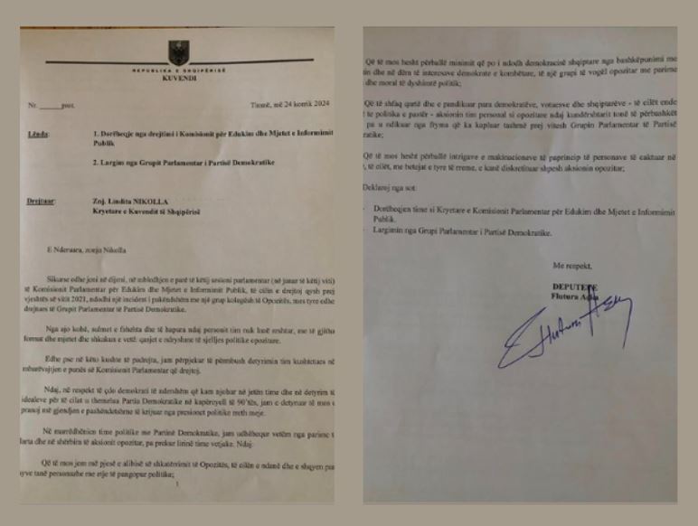 Deputetja Flutura Açka ka njoftuar largimin e saj nga Drejtimi i Komisionit Parlamentar për Edukim dhe Mjetet e Informimit Publik dhe largim nga Grupi Parlamentar i Partisë Demokratike.
