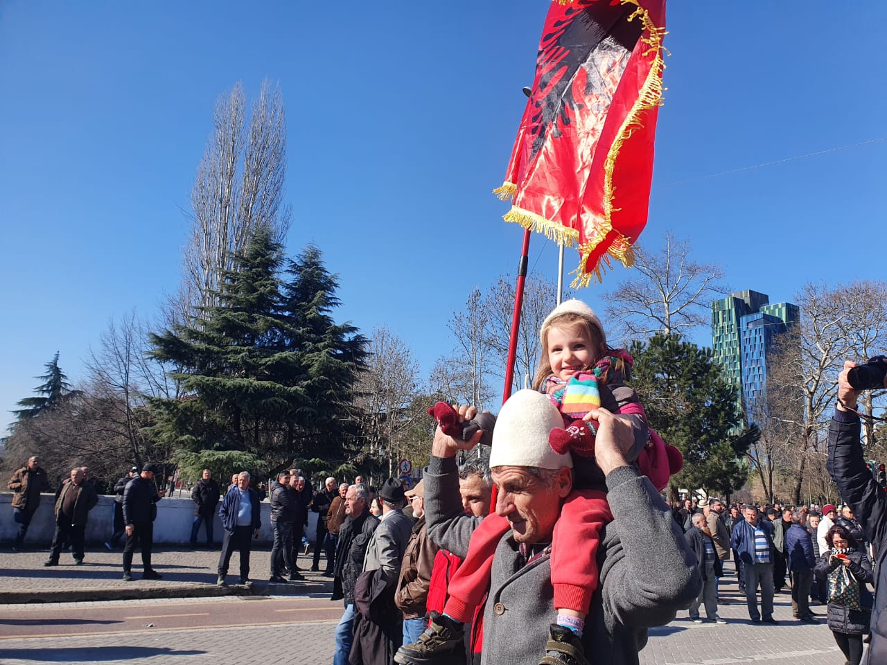 Një protestues ka dalë në protestë me mbesën në supet e tij.
