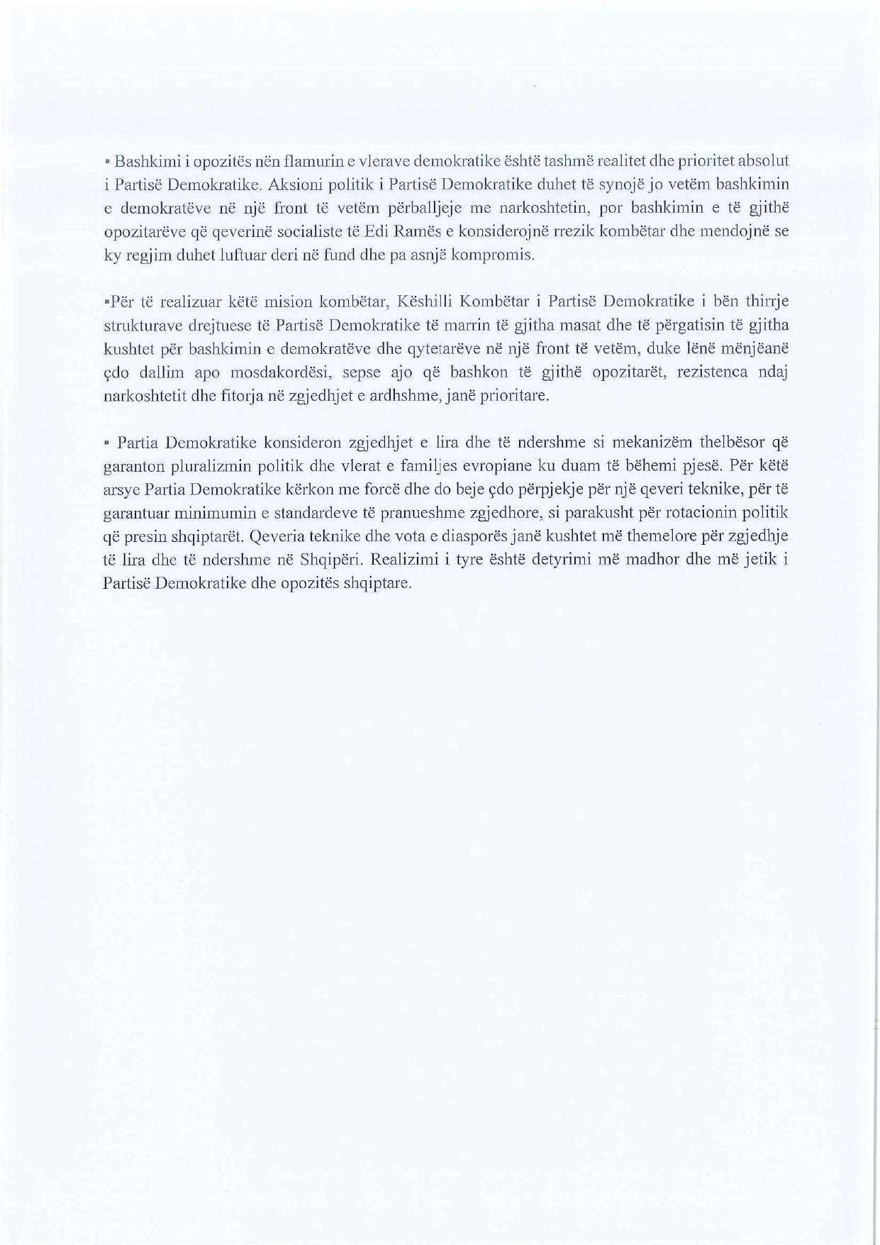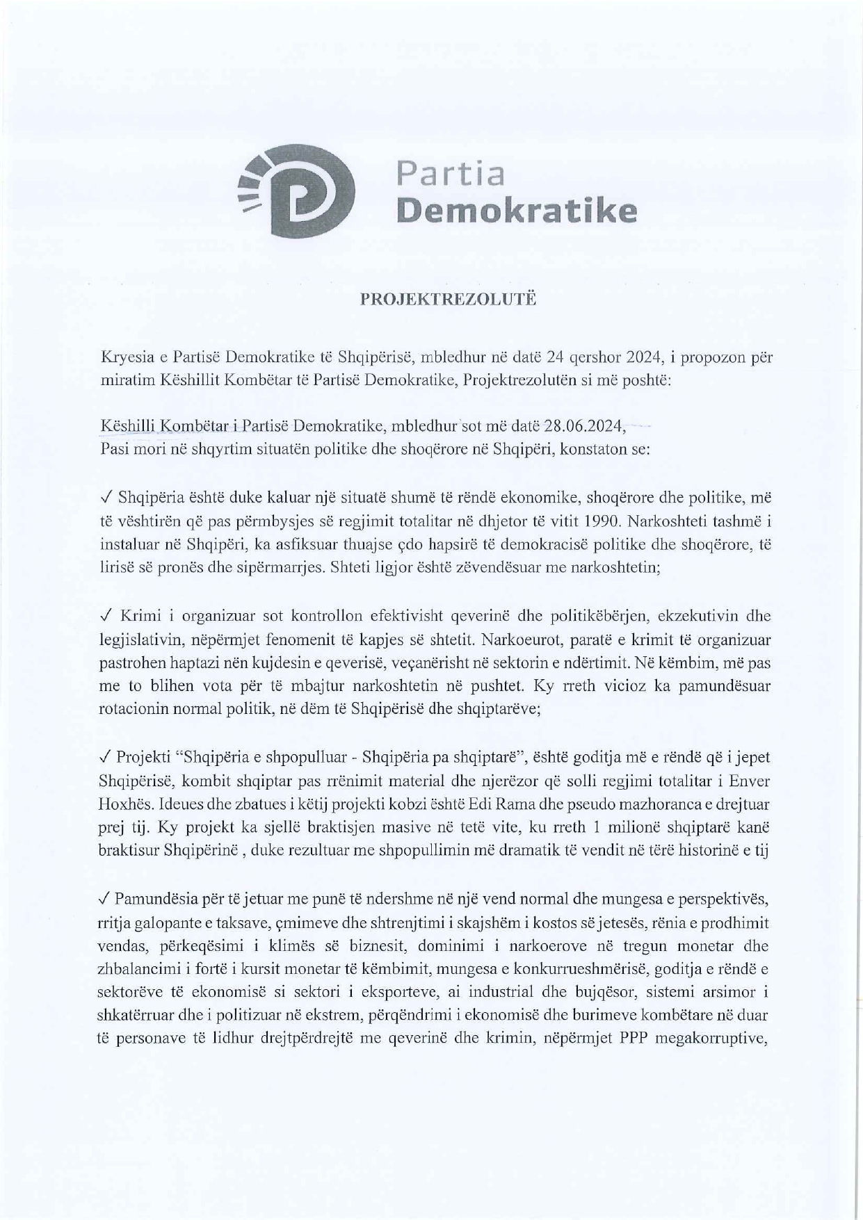 Në funksion të kësaj, në rezolutën e miratuar nga Kryesia e PD-së, i kërkohet degëve të kësaj partie, që të përgatisin terrenin për të bashkuar të gjithë demokratët dhe opozitarët, duke lënë mënjanë çdo ndasi, mosdakordësim apo dallim. Në projekt-rezolutë vihet theksi te qeveria teknike, ndërsa PD angazhohet se do të bëjë gjithçka për të realizuar këtë, si të vetmen rrugë që mund të garantojë zgjedhjet e lira dhe të ndershme.