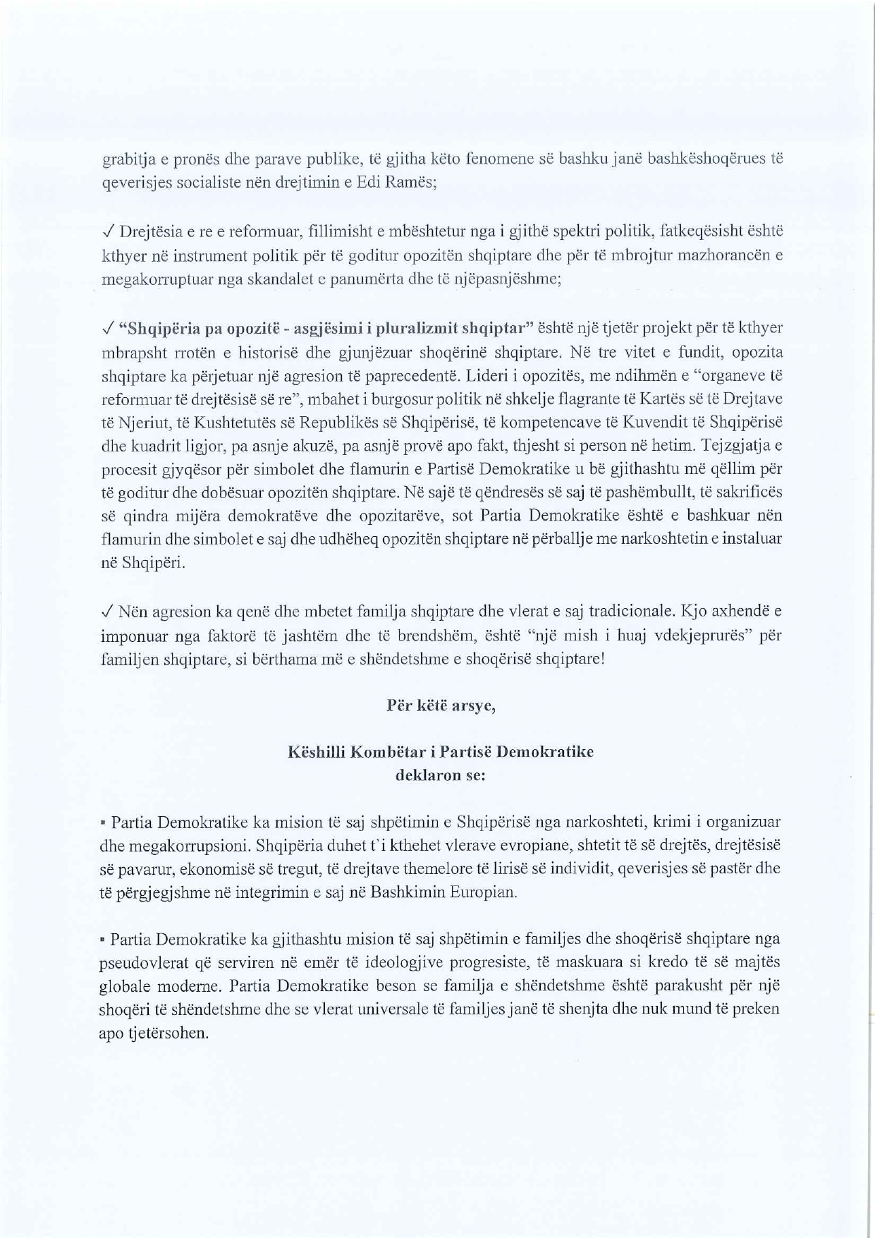 “Shqipëria është duke kaluar një situatë shumë të rëndë ekonomike, shoqërore dhe politike, më të vështirën që pas përmbysjes së regjimit totalitar në dhjetor të vitit 1990. Narkoshteti tashmë i instaluar në Shqipëiri, ka asfiksuar thuajse çdo hapësirë të demokracisë politike dhe shoqërore, të lirisë së pronës dhe sipërmarrjes. Shteti lgjor është zëvendësuar me narkoshtetin;