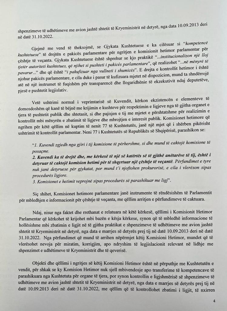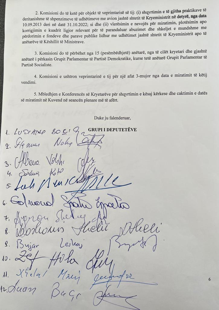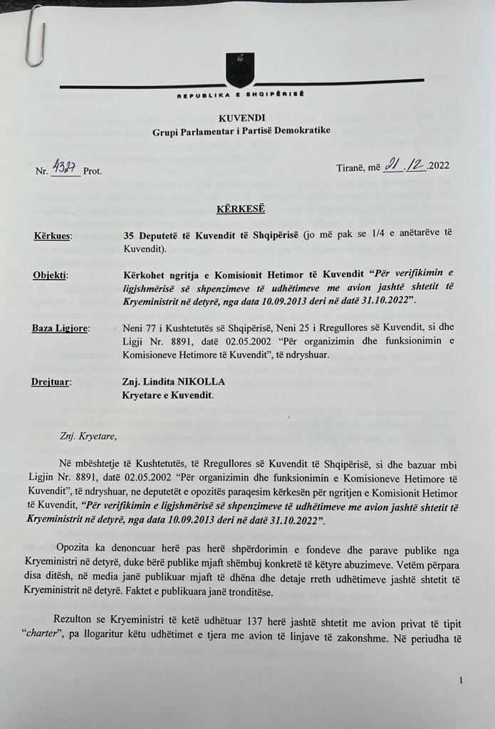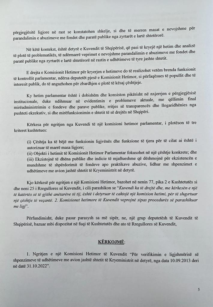 36 deputetë të opozitës, përfshi edhe disa nga grupi i Alibeajt si Dhurata Çupi, Merita Bakiu dhe Kreshnik Çollaku, depozituan kërkesën për ngritjen e Komisionit Hetimor “Për verifikimin e ligjshmërisë së shpenzimeve të udhëtimeve me avion jashtë shtetit të Kryeministrit në detyrë, nga data 10.09.2013 deri në datë 31.10.2022″.