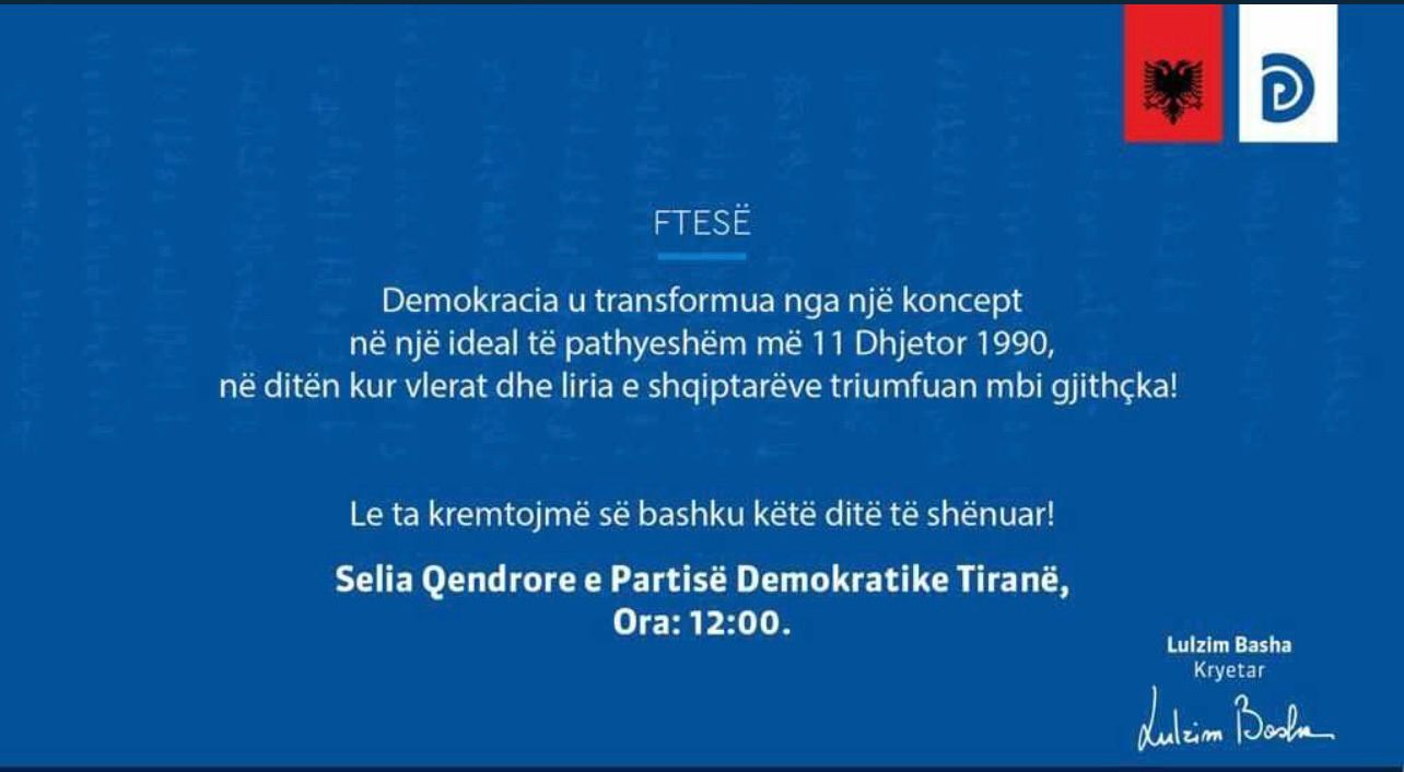 “Demokracia u transformua nga një koncept në një ideal të pathyeshëm më 11 Dhjetor 1990, në ditën kur vlerat dhe liria e shqiptarëve triumfuan mbi gjithçka! Le të kremtojmë së bashku këtë ditë të shënuar” – thuhet ftesën e Bashës.