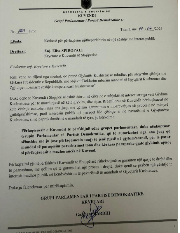 Kreu i Grupit Parlamentar të Partisë Demokratike, Gazmend Bardhi, i ka dërguar një shkresë zyrtare kryetares së Kuvendit, Elisa Spiropali, duke kërkuar përfshirjen e opozitës parlamentare në seancën që do të zhvillohet në Gjykatën Kushtetuese, lidhur me interpretimin e mandateve të gjyqtarëve të këtij institucioni.