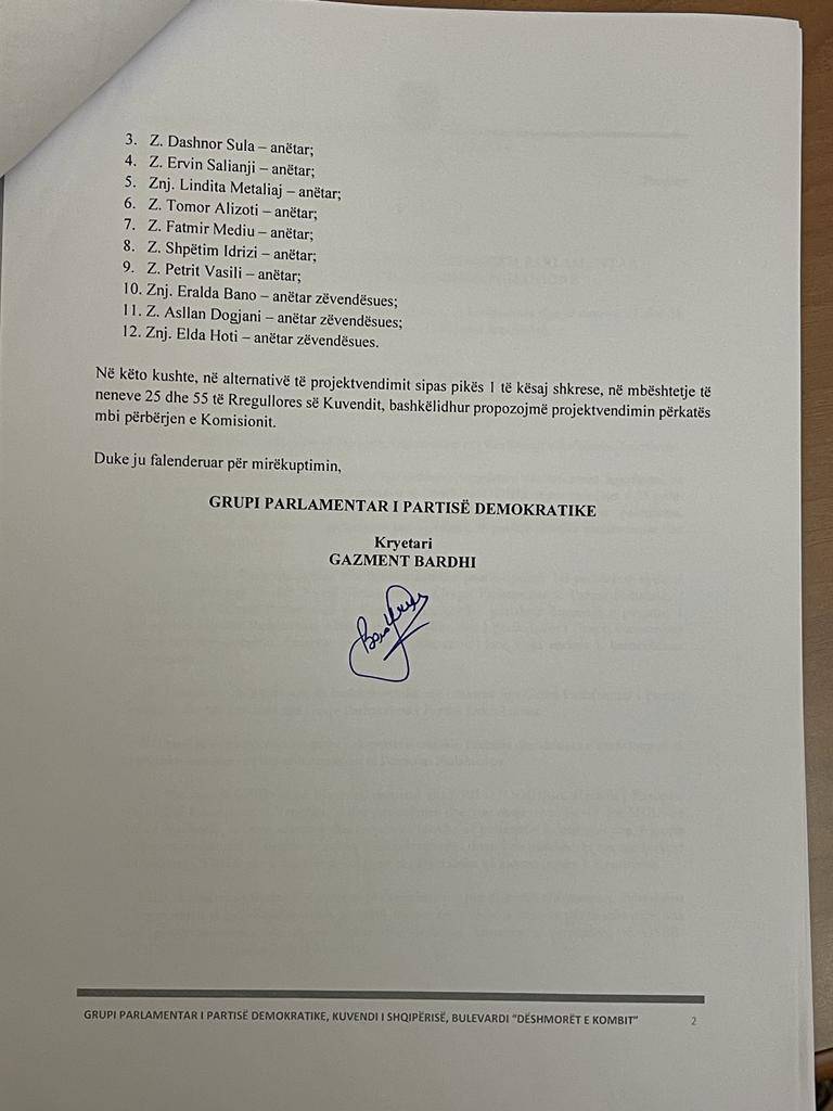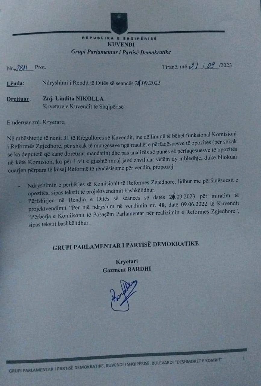 Demokrati Gazmend Bardhi i është drejtuar me një kërkesë kryetares së Kuvendit, për të futur në rendin e ditës ndryshimin e përbërjes së Komisionit Parlamentar për reformën zgjedhore.