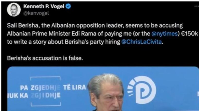Gazetari i njohur i New York Times, Kenneth P. Vogel, ka mohuar akuzat e Sali Berishës, i cili pretendoi se kryeministri Edi Rama ka paguar 150 mijë euro për artikullin mbi punësimin e Chris LaCivita nga Partia Demokratike.
