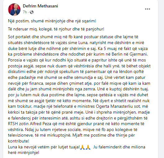 Porosia e vajzës që kur ndodhi kjo situatë e papritur ishte që unë të mos postoja asgjë, sepse nuk duam që vështirësia dhe halli ynë, të bëhet objekt diskutimi edhe për ndonjë spekullum të pamerituar që na lëndon qoftë edhe padashje më shumë se edhe sëmundja e saj. Unë vërtet kam patur nevojë për financa, sepse dihen çmimet atje, por falë miqve që kam ia kam dalë dhe ju jam shumë mirënjohës nga zemra. Unë e kuptoj dëshirën tuaj, por ju lutem nuk dua postime dhe lajme, sepse qetësia e vajzës më duhet më shumë se asgjë tjetër në këto momente. Në dyert e shtetit realisht nuk kam trokitur, madje një telefonatë e ministres Ogerta Manasterliu sot, më kërkoi ta takoja për të qënë pranë meje. Unë i shpreha mirënjohjen, madje e falenderoj për interesimin atë, ashtu si edhe drejtorin e përgjithshëm të RTSH zotin Alfred Peza që më është gjendur pranë në këto momente të vështira. Ndaj ju lutem rrjeteve sociale, miqve në fb apo kolegëve të televizioneve, të më mirkuptojnë. Mjaft me postime dhe thirrje për kontribute!