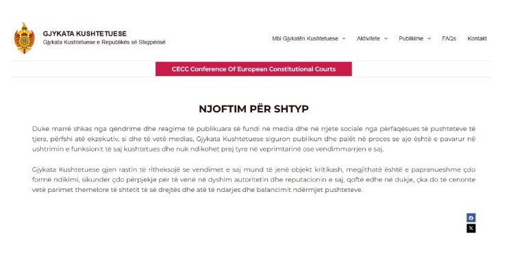 Duke marrë shkas nga qëndrime dhe reagime të publikuara së fundi në media dhe në rrjete sociale nga përfaqësues të pushteteve të tjera, përfshi atë ekzekutiv, si dhe të vetë medias, Gjykata Kushtetuese siguron publikun dhe palët në proces se ajo është e pavarur në ushtrimin e funksionit të saj kushtetues dhe nuk ndikohet prej tyre në veprimtarinë ose vendimmarrjen e saj.