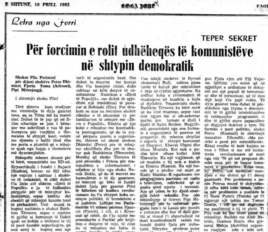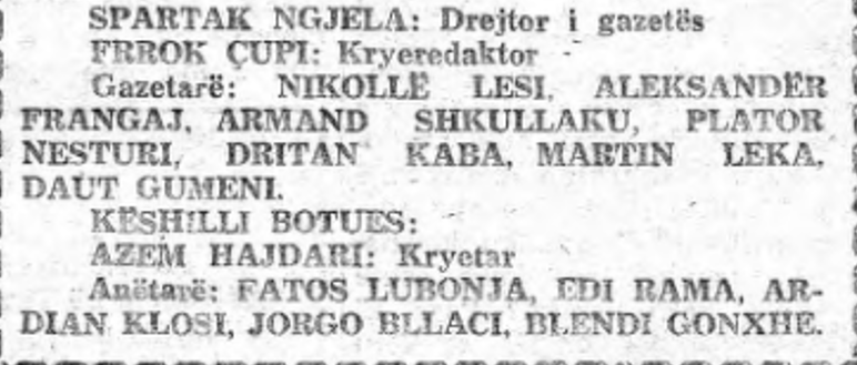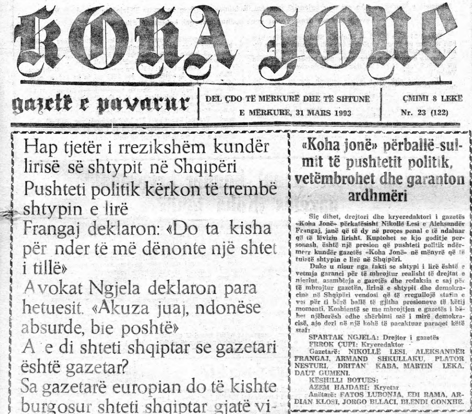 Me pas vjen data 31 mars 1993 kur pushteti i Berishës mori në ndjekje penale dy drejtuesit kryesorë të gazetës, Nikoll Lesi dhe Aleksandër Frangaj. Ishte data 31 mars 1993, datë e cila nuk duhet harruar, kur erdhën në krye të gazetës KOHA JONE për ta ndihmuar që pushteti i Sali Berishës të mos e mbyllte përfundimisht, pikërisht Heroi i Demokracisë Azem Hajdari si kryetar i Këshillit Botues, Spartak Ngjela si drejtor, Frrok Çupi si kryeredaktor dhe Edi Rama i cili erdhi direkt nga Parisi dhe mblodhi disa intelektualë të kohës duke i futur në Këshillin Botues të KOHA JONE.
