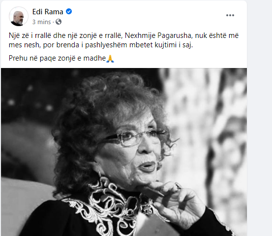 “Një zë i rrallë dhe një zonjë e rrallë, Nexhmije Pagarusha, nuk është më mes nesh, por brenda i pashlyeshëm mbetet kujtimi i saj. Prehu në paqe zonjë e madhe?”, shkruan Rama.