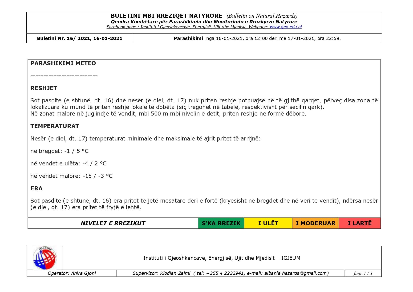 Instituti i Gjeoshkencave, Energjisë, Ujit dhe Mjedisit thotë se sot pasdite (e shtunë, dt. 16) dhe nesër (e diel, dt. 17) nuk priten reshje pothuajse në të gjithë qarqet, përveç disa zona të lokalizuara ku mund të priten reshje lokale të dobëta.