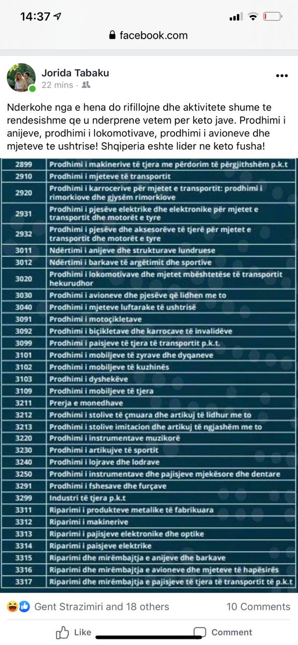 “Ndërkohë nga e hëna do rifillojnë dhe aktivitete shumë të rëndësishme që u ndërprenë vetëm për këto javë. Prodhimi i anijeve, prodhimi i lokomotivave, prodhimi i avionëve dhe mjeteve të ushtrisë! Shqipëria është lider në këto fusha!”,- shkruan Jorida Tabaku në Facebook.