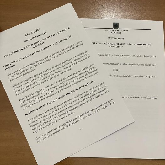 Ditën e sotme depozitova në Kuvend një Amendament në lidhje me Draft Ligjin për Tatimin mbi të Ardhura që parashikon tatimin në 23% për profesionistët e lirë dhe bizneset e vogla.
