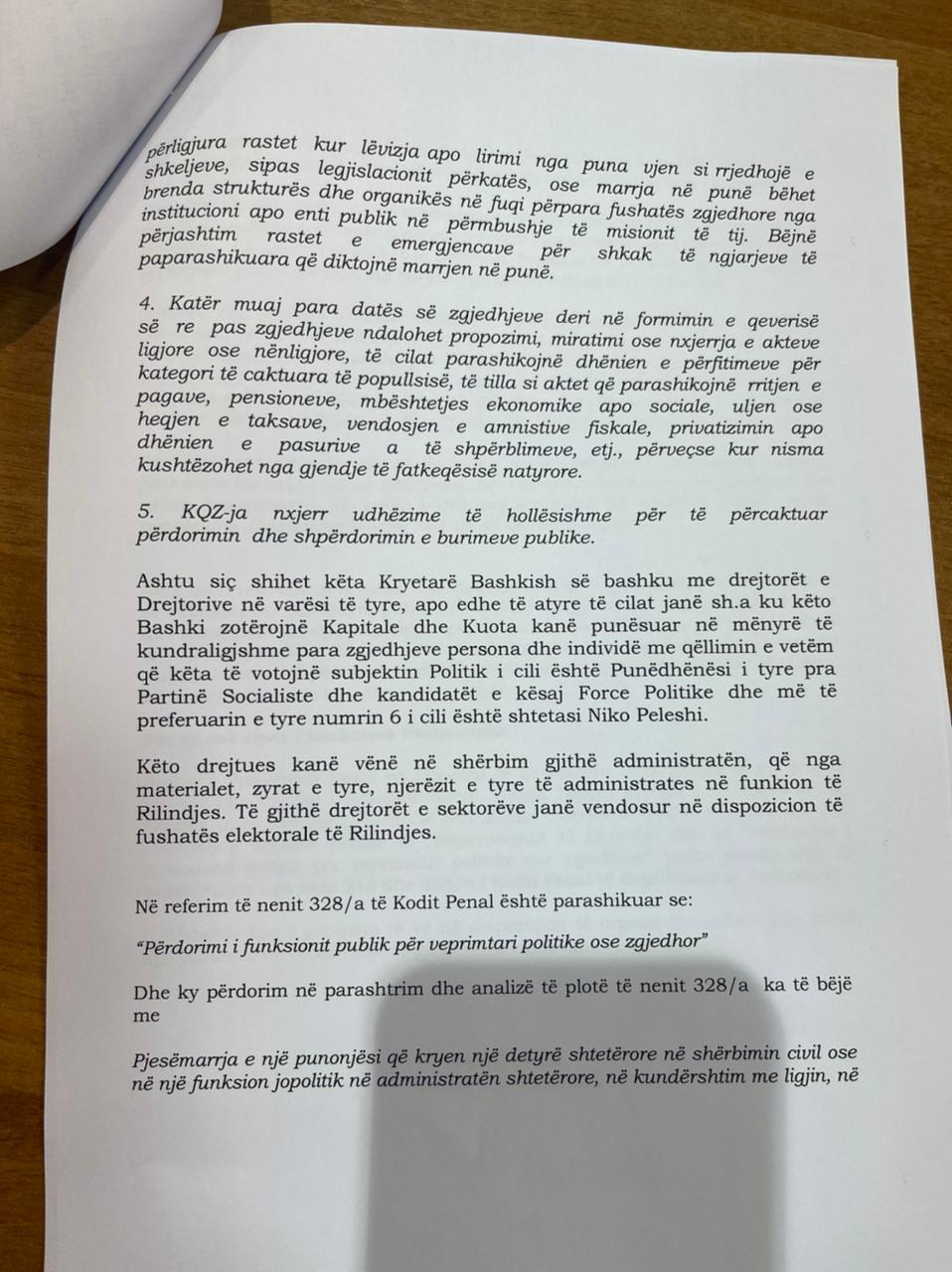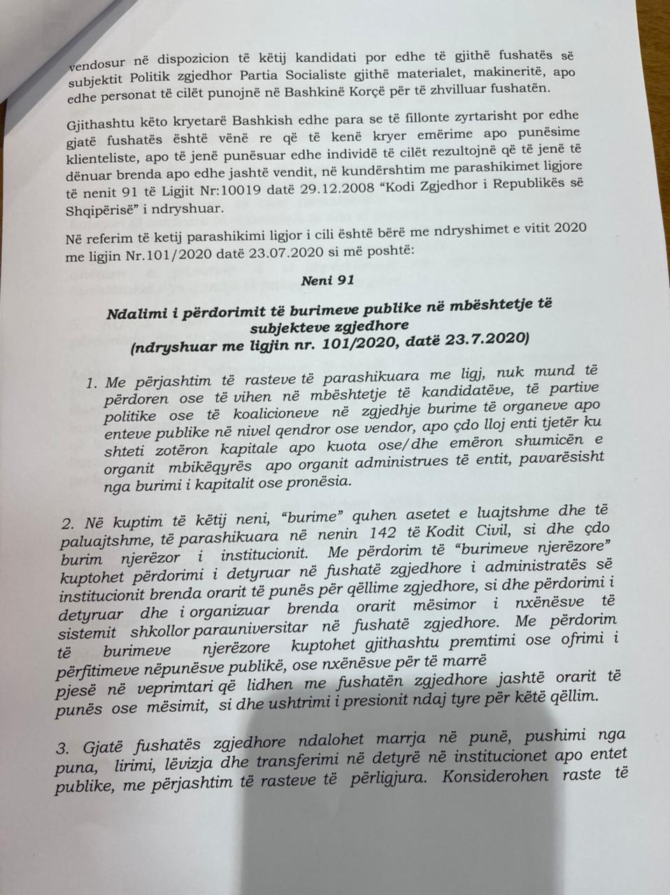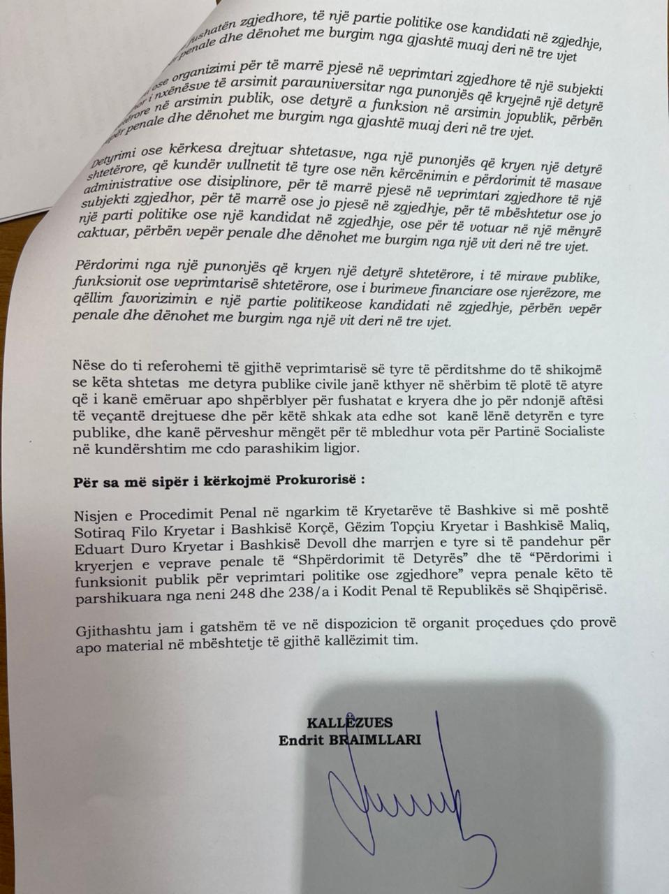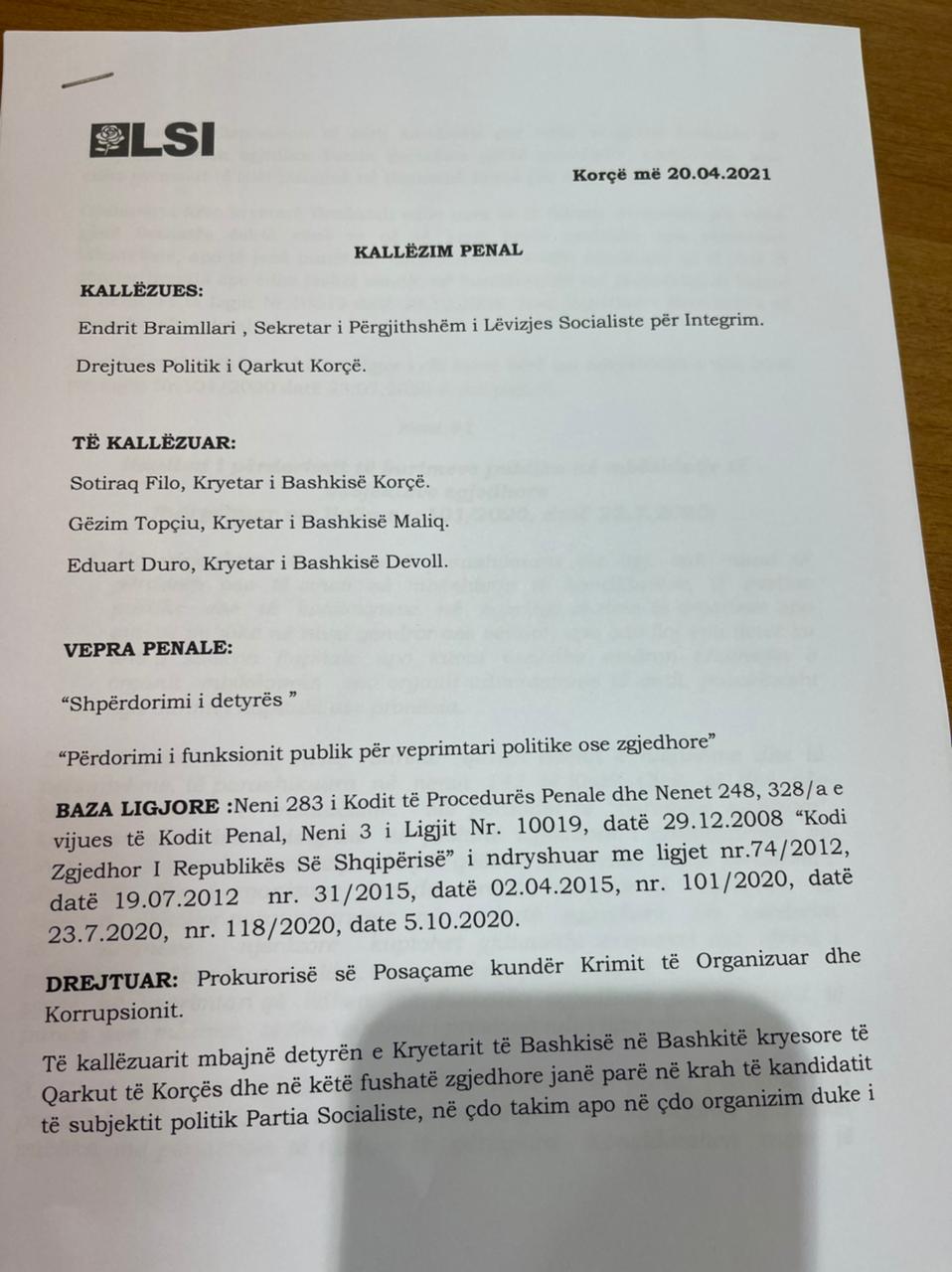 “Jemi në këtë komunikim me mediat për të kallëzuar penalisht Sotiraq Filon, kryetari i Bashkisë së Korçës, Gëzim Topçiu, kryetari i Bashkisë së Maliqit, Eduard Duro, kryetari i Bashkisë së Devollit, për veprën penale të ‘shpërdorimit të detyrës’ ‘përdorimin e funksionit publik për veprimtari politike dhe zgjedhore’. Kallëzimi i është drejtuar Prokurorisë së Posaçme për Krim të Organizuar dhe Korrupsion, ose ndryshe SPAK. Këta drejtues institucionesh, të frymëzuar në mënyrë të paligjshme nga Niko Peleshi kanë emëruar shtetas në kundërshtim me ligjin, përdorin administratën publike në funksion të kandidatit të rilindjes në Korçë dhe të gjithë infrastrukturën e Bashkisë. Në kundërshtim me ligjin, këta drejtues kanë emëruar në funksionet publike pjesëtarë të krimit të organizuar dhe subjekte të OFL-së. Niko Peleshi dhe ushtarët e tij po përdorin Operacionin ‘Forca e Ligjit’ në funksionin e tij personal. Individë me rekorde kriminale, subjekte të OFL-së, kanë ofruar mbështetje personale, por jo vetëm kaq, për shërbimin që do të japin në fushatë, i ka emëruar edhe në funksione publike. Po ja bëj të qartë Niko Peleshit, Sotiraq Filos, Gëzim Topçiut, Eduard Duros që do më kenë përballë me fakte konkrete dhe të pa tjetërsuara, për t’ia bërë të qartë çdo qytetari të Korçës që administrata publike në Korçë nuk është në shërbimin e qytetarëve, por në interesin personal të Niko Peleshit. Për të rinjtë dhe të rejat e Korçës nuk ka vende pune, sepse Niko Peleshi me bandën e tij i ka zënë me individë subjekte të OFL-së dhe të krimit të organizuar. Ndaj të dashur qytetarë, 25 Prilli është një ditë shumë e rëndësishme për tu ndarë njëherë e përgjithmonë nga kjo politikë e vjetër, e interesit personal, e shantazhit ndaj qytetarëve dhe të administratës publike. Korça ka nevojë për një frymë të re. Korça ka nevojë për të zgjedhur në Parlament individë që janë në shërbim të komunitetit dhe jo në shërbimin personal të Niko Peleshit. Më 25 Prill ju ftoj të votoni numrin 6, Lëvizjen Socialiste për Integrim. Numri 6 është numri i shpresës dhe i mundësive të punësimit dhe mbështetjes së rinisë korçare”, deklaroi Sekretari i Përgjithshëm i LSI-së, Endrit Braimllari.