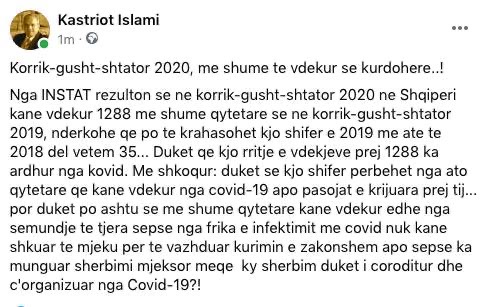 Nga INSTAT rezulton se në korrik-gusht-shtator 2020 në Shqipëri kanë vdekur 1288 më shumë qytetarë se në korrik-gusht-shtator 2019, ndërkohë që po të krahasohet kjo shifër e 2019 me atë të 2018 del vetëm 35… Duket që kjo rritje e vdekjeve prej 1288 ka ardhur nga covid. Më shkoqur: duket se kjo shifër përbëhet nga ata qytetarë që kanë vdekur nga covid-19 apo pasojat e krijuara prej tij… por duket po ashtu se më shumë qytetarë kanë vdekur edhe nga sëmundje të tjera sepse nga frika e infektimit me covid nuk kanë shkuar te mjeku për të vazhduar kurimin e zakonshëm apo sepse ka munguar shërbimi mjekësor meqë ky shërbim duket i çoroditur dhe çorganizuar nga Covid-19?!