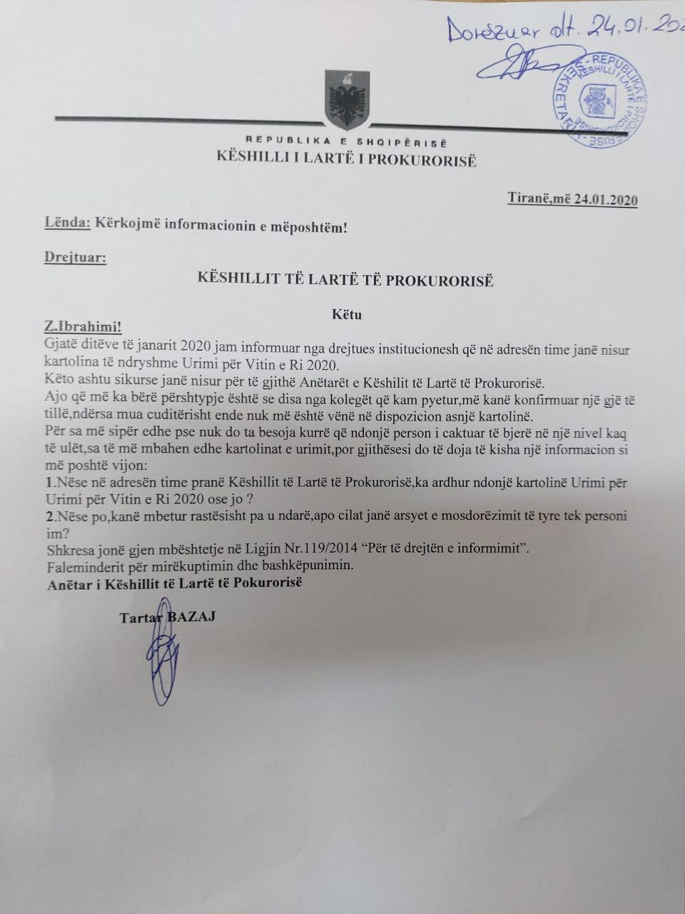 Tartar Bazaj, anëtarë i Këshillit të Lartë të Prokurorisë, i ka dërguar një kërkesë të pazakontë kreut të KLP, Gent Ibrahimit. Në këtë letër zyrtare, Bazaj shprehet se sipas informacioneve të tij, gjatë muajit Janar, në adresë të tij i janë dërguar disa kartolina të ndryshme urimi për Vitin e Ri.