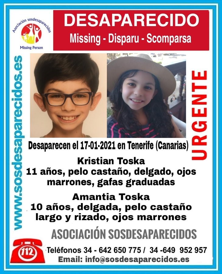 Shoqata SOSdesaparecidos në Spanjë, ka publikuar këtë të diel njoftimin për zhdukjen e dy fëmijëve (motër e vëlla), Kristian Toska dhe Amantia Toska, përkatësisht të moshës 11 dhe 10 vjeç, pasi nëna e fëmijëve kishte denoncuar më 17 janar të këtij viti pretendimin e rrëmbimit të të dy fëmijëve në Gjermani nga babai i tyre, vendndodhja e të cilit është gjithashtu i panjohur, siç njoftoi këtë të Dielë nga Radio Club Tenerife në lajmet e saj të dielen në orën 13:00.