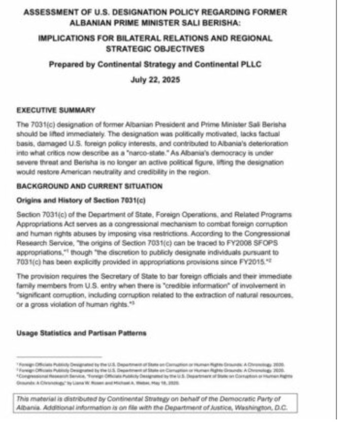 “Përderisa Sali Berisha nuk është më një figurë aktive politike, heqja e kësaj shpalljeje do të ndihmonte në rikthimin e neutralitetit dhe besueshmërisë së SHBA-së në Ballkan”, thuhet në kërkesën e Continental Strategy, ku gjithashtu përmendet se situata në Shqipëri është përkeqësuar dhe po përshkruhet nga kritikët si një “shtet-narkotik”.