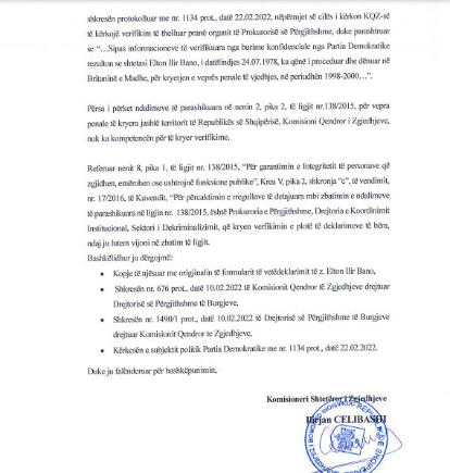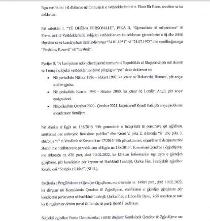 Sipas KQZ-së, nga verifikimet e bëra nga vetëdeklarimi i kandidatit, nuk janë evidentuar dënime të formës së prerë.