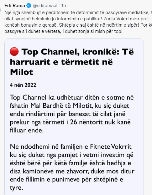 Kryeministri Rama i ka dhënë një goditje tjetër Top Channel. Në lidhje me një informacion të publikuar nga TCH ka reaguar Edi Rama.
